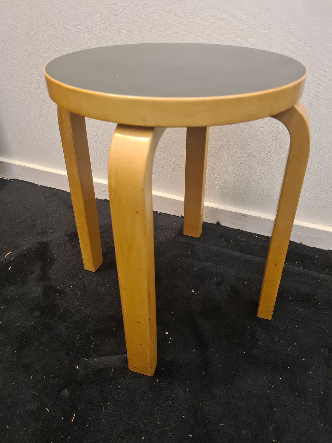 Taburet designet af Alvar Aalto. Her i bøg med sæde i sort formika. Fremstår pæn og velholdt uden de store brugsspor.