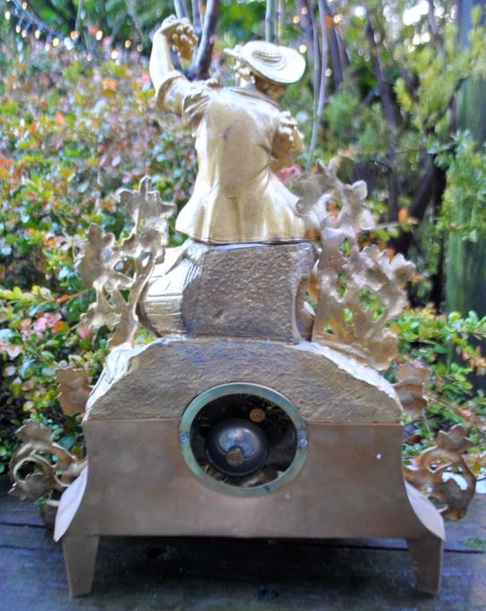 Bronzeret zinkur, ca. 1870, Frankrig. Hovedfigur af ung mand, der sidder ovenpå en tønde med et krus. Hele uret dekoreret med vinløv og druer. Hvidemaljeret skive med romertal. Skive signeret: J. A, Hansen, Odense. H. 45 cm. B.: 42 cm. D.: 12 cm.