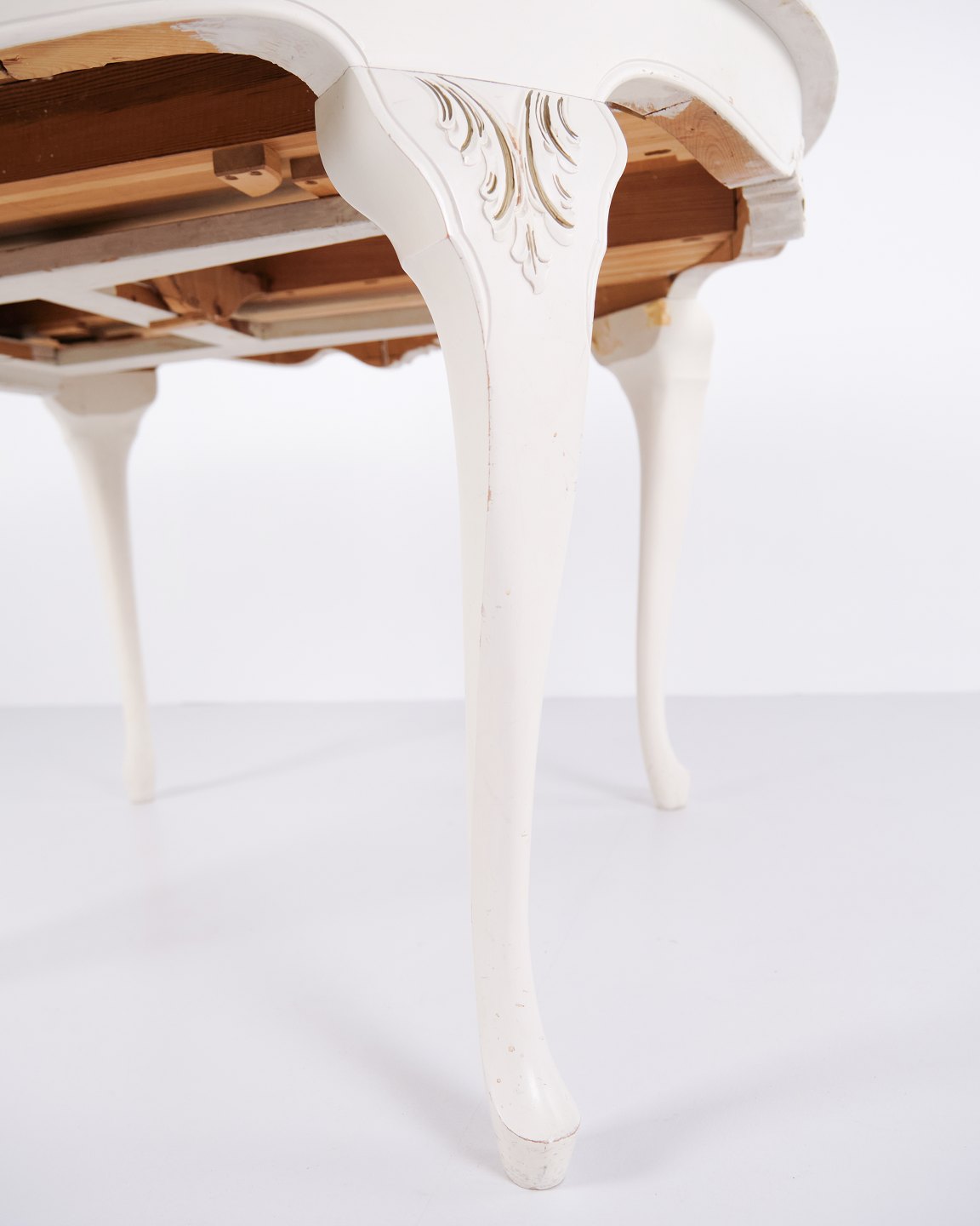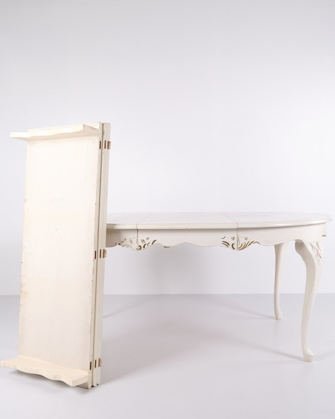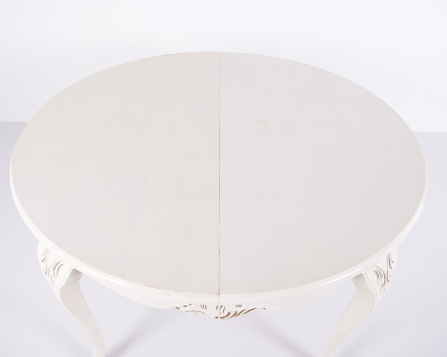Antik rundt spisebord i ny rokoko stil fra 1920’erne. Hvidmalet med dekorative detaljer og 4 tillægsplader.