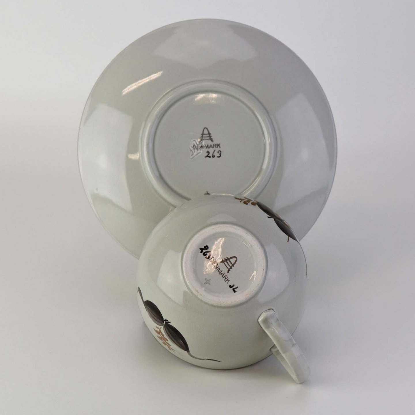 Tekop med underkop i fajance fra stellet Kirsten, som blev fremstillet i perioden 1934-1957. Nr. 263