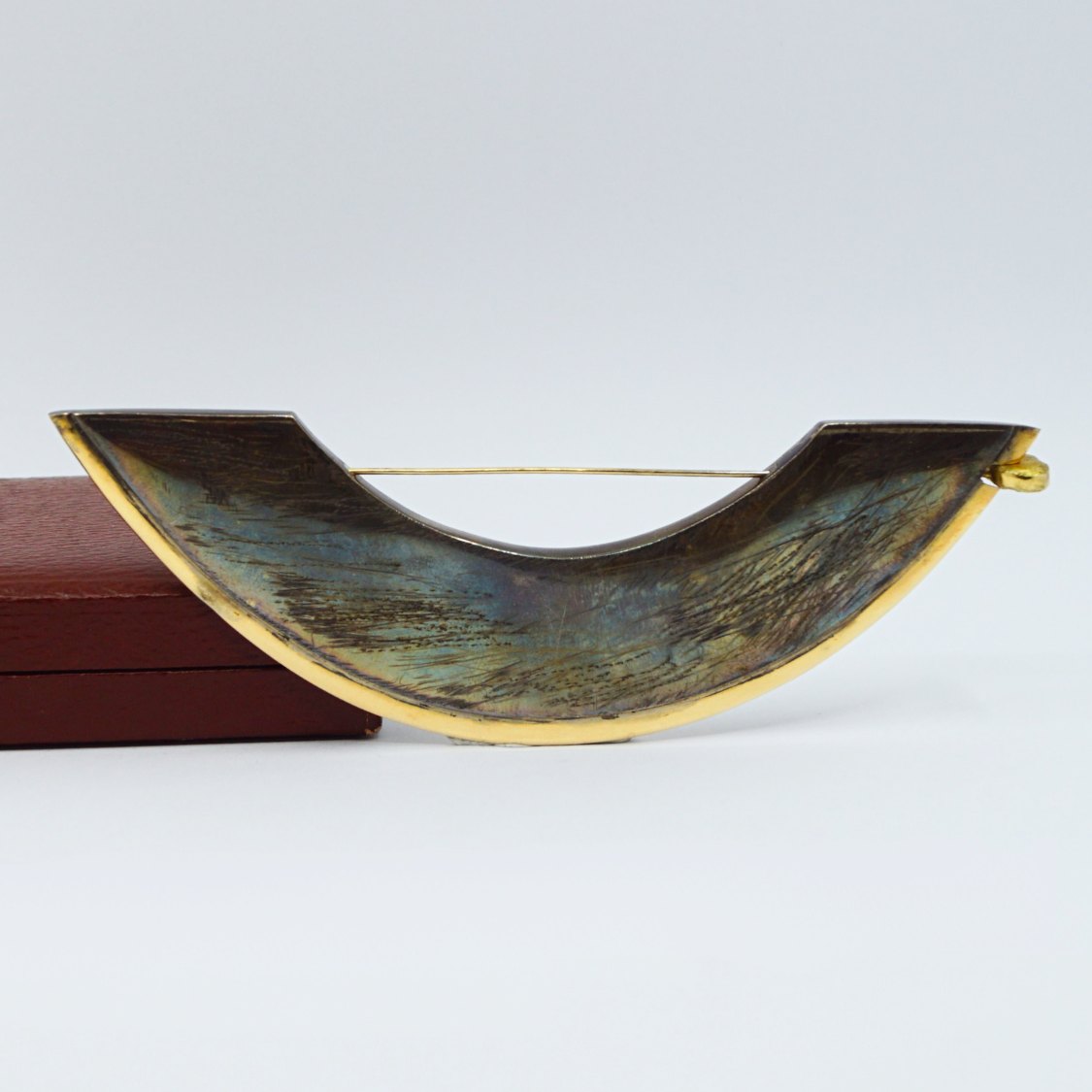 Anette Kræn; Large silver brooch with oxidized surface and 14k gold. Can be turned in two different ways, each with its own expression.