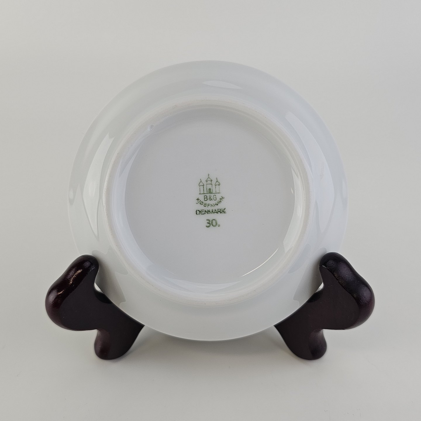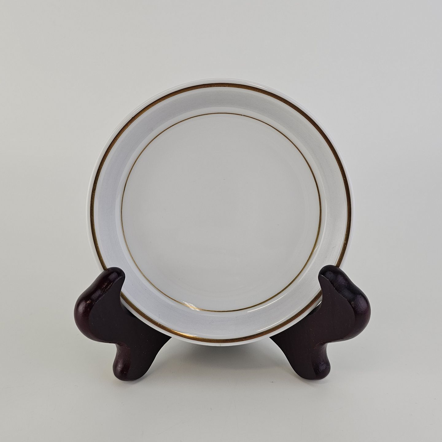 Tiber er stel i glat hvidt porcelæn med grå bort og guldkant