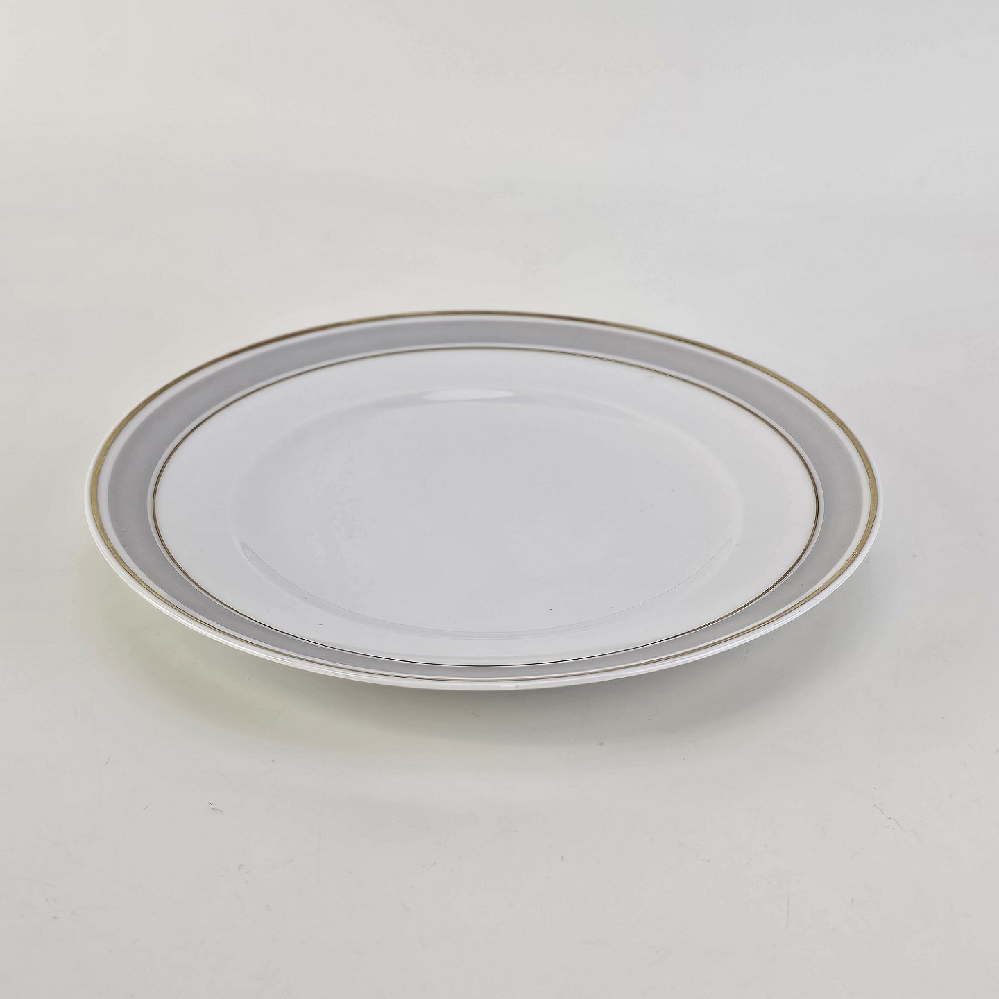 Tiber er stel i glat hvidt porcelæn med grå bort og guldkant