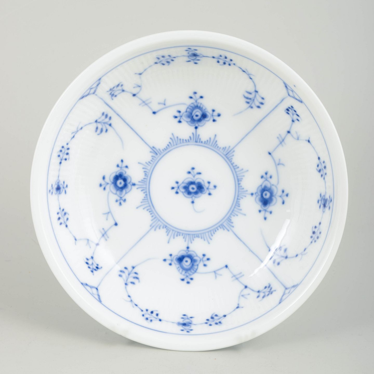 Blue Fluted Plain is Royal Copenhagen’s oldest and most enduring pattern, first introduced in 1775. Inspired by Chinese porcelain, the decoration is executed in freehand-painted cobalt blue underglaze, giving each piece subtle individual variation. Bowls produced in the 1920s reflect a continuation of traditional forms combined with refined craftsmanship, and are today valued for both their aesthetic quality and historical significance.