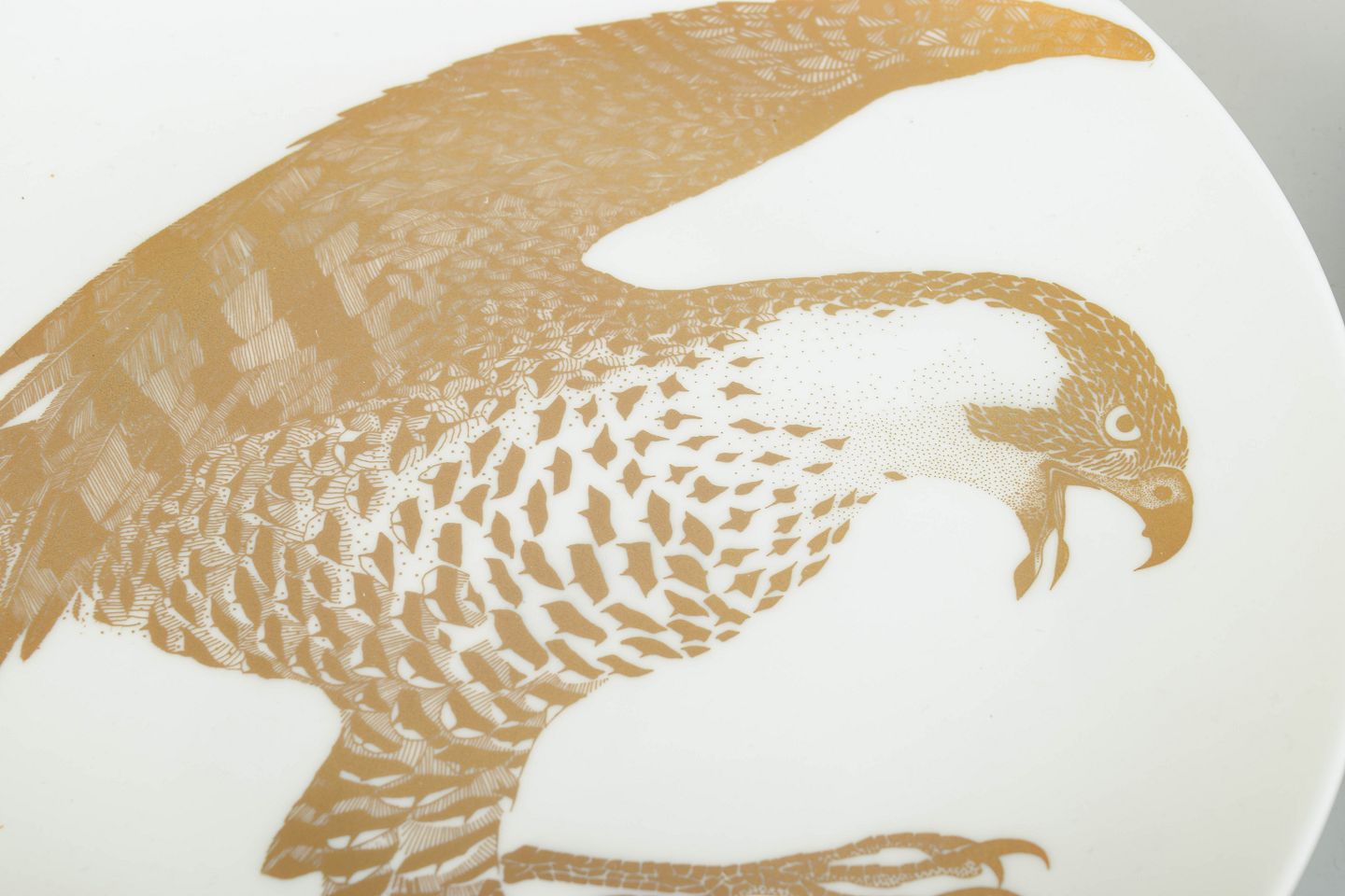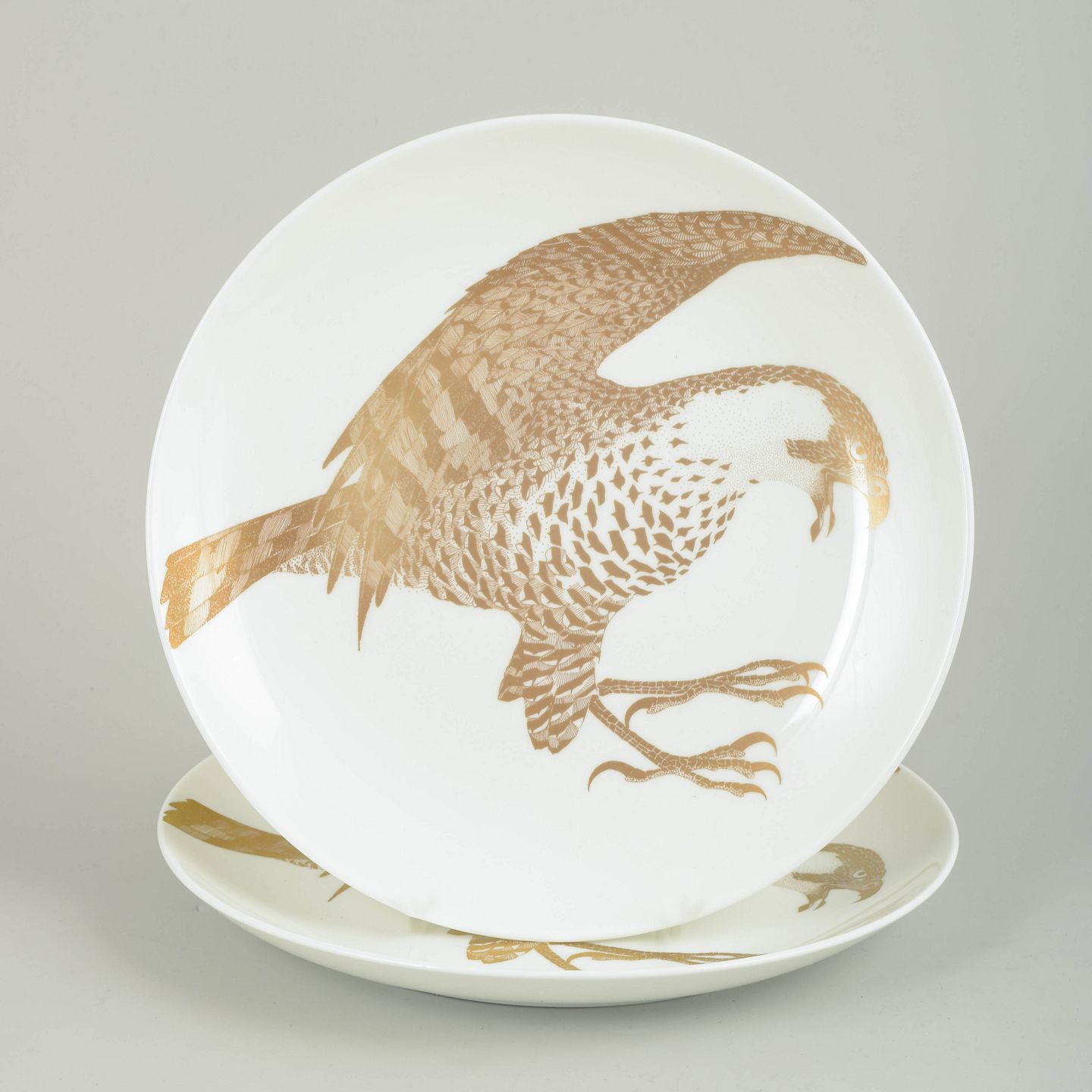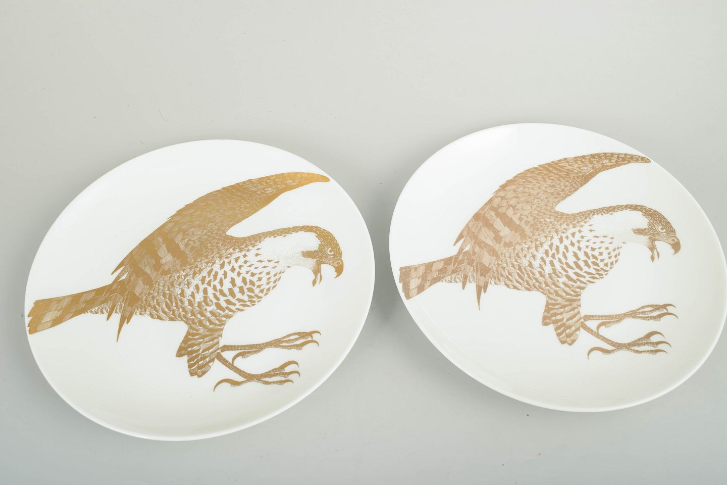 Set of two porcelain collector’s plates decorated with a white-tailed eagle motif in gold. The plates belong to the “Arter i fara” series, model Havsörn, produced in limited numbers during the 1980s. The reverse features printed information including the title, series number and a short text about the species.