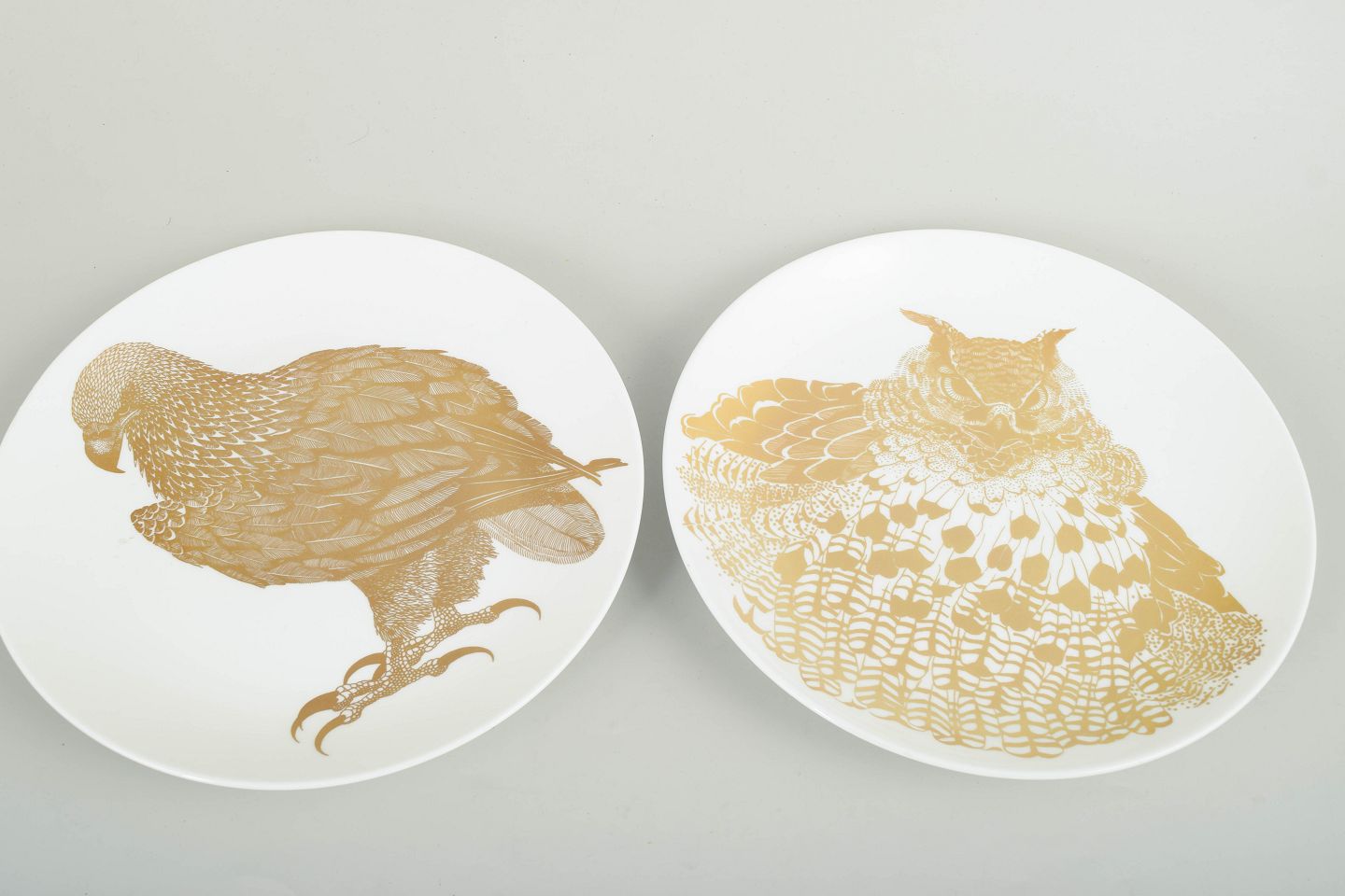 Dekorative samlertallerkener i porcelæn med motiv af havørne og ugle i gulddekoration. Bagsiden har trykt tekst med titel, serienummer og artsbeskrivelse.