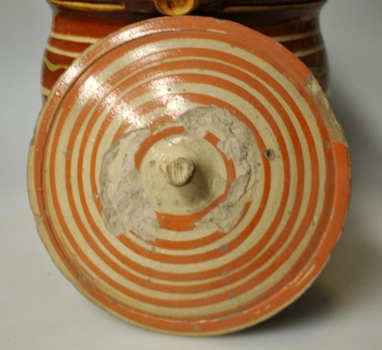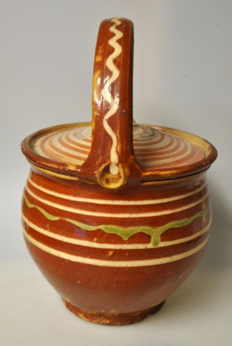 Barsels spand i glaseret lertøj, 19. årh. Danmark. Med rødbrun glasur og striber i hvid og grøn. H. inkl. hank: 28 cm.