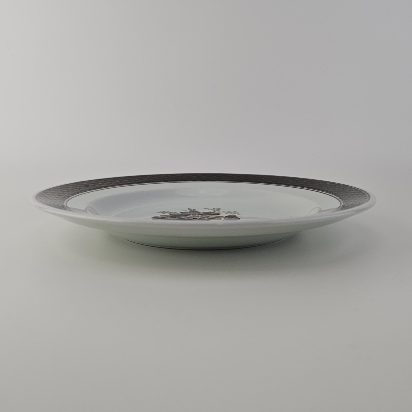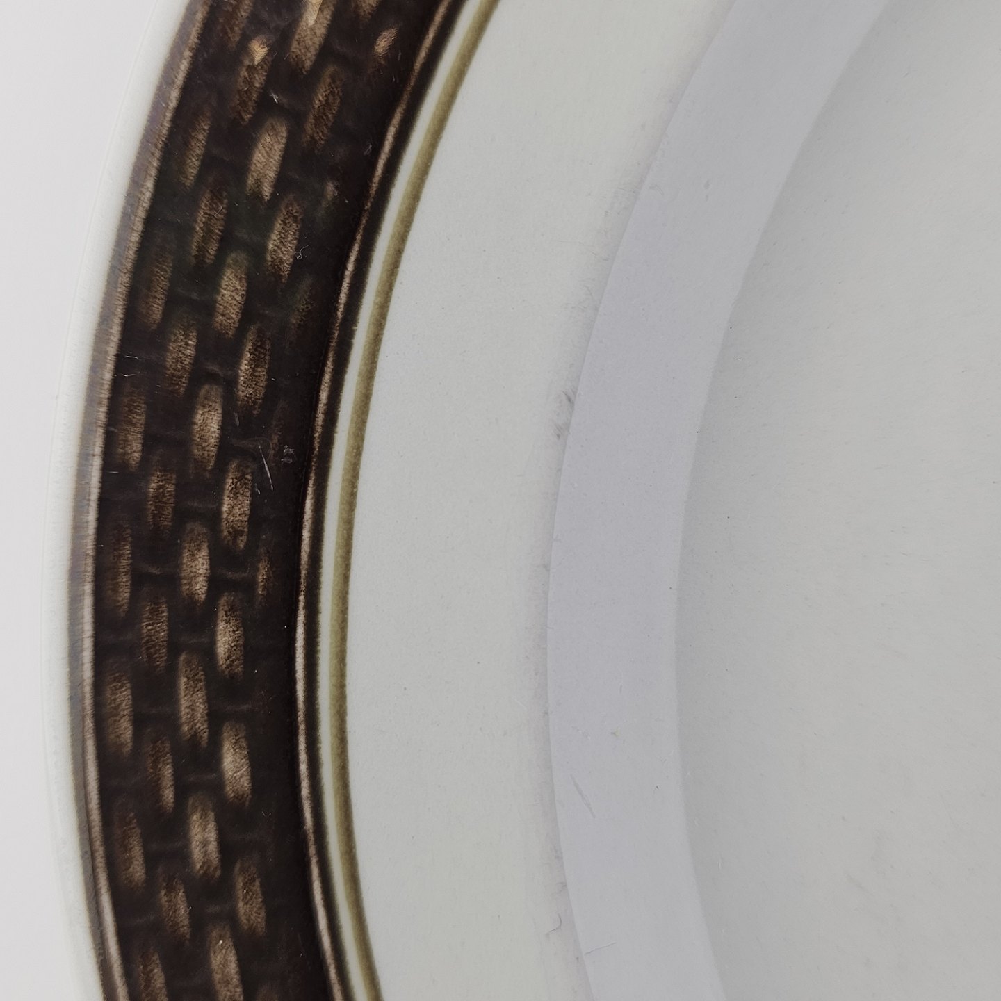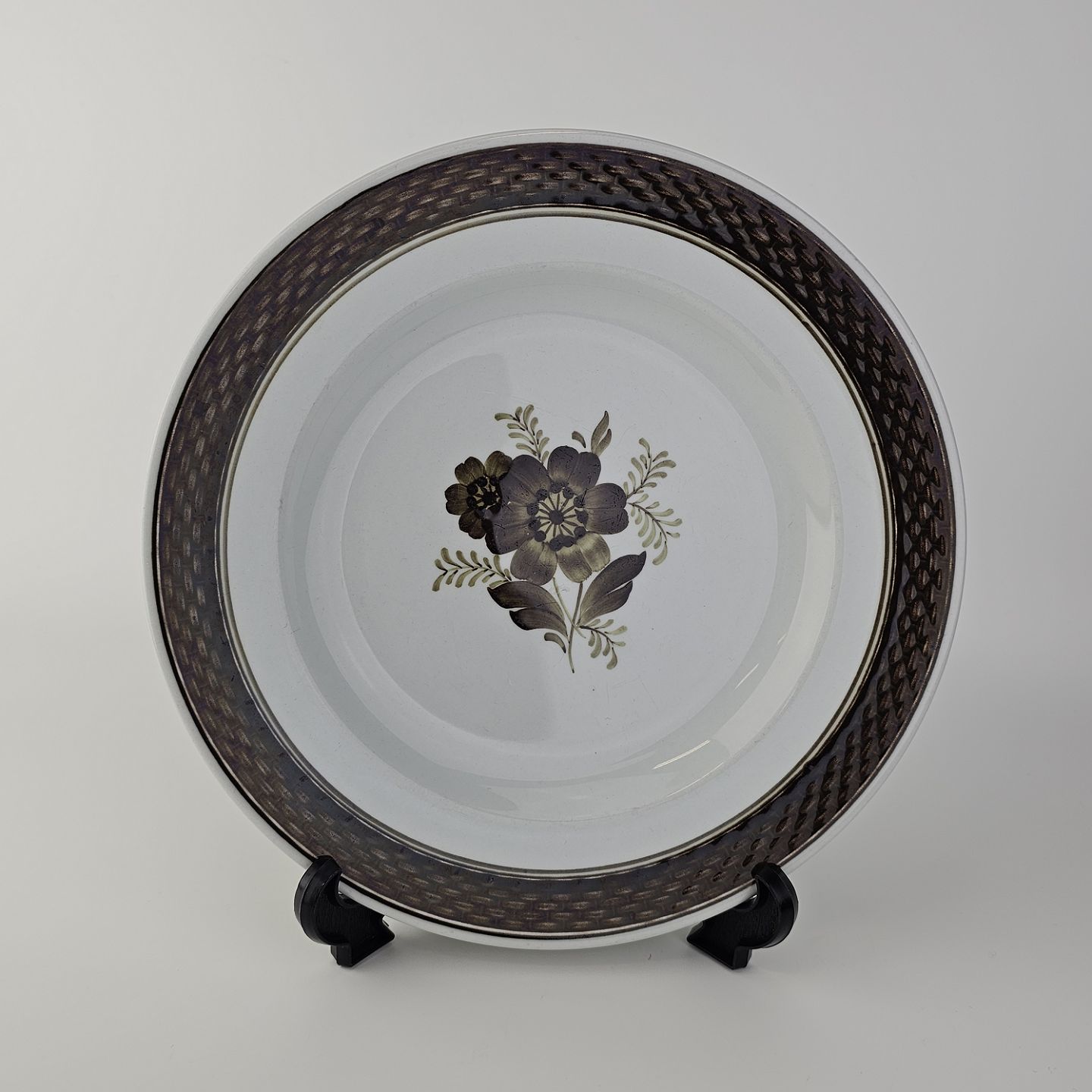 Fajancestellet med flettet kant og dekoration af brune blomster på lys baggrund med brun kant