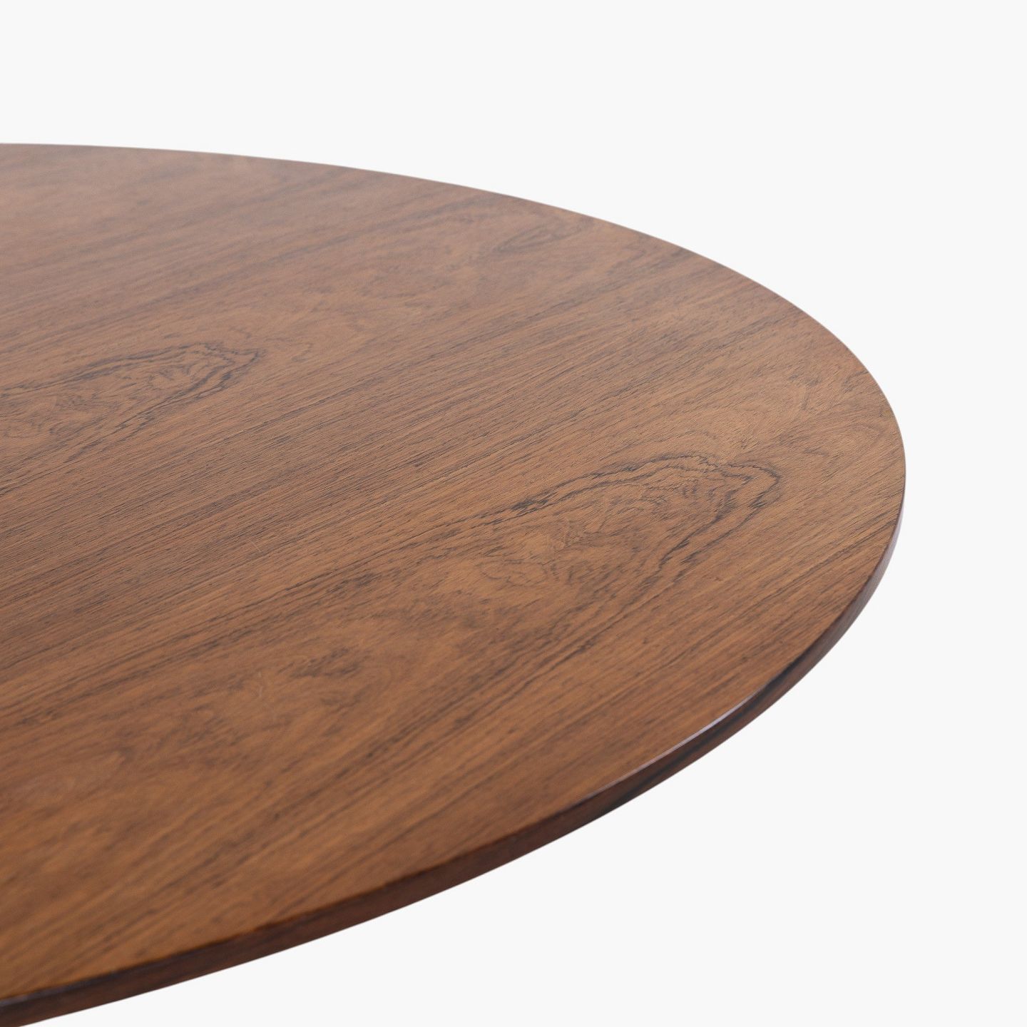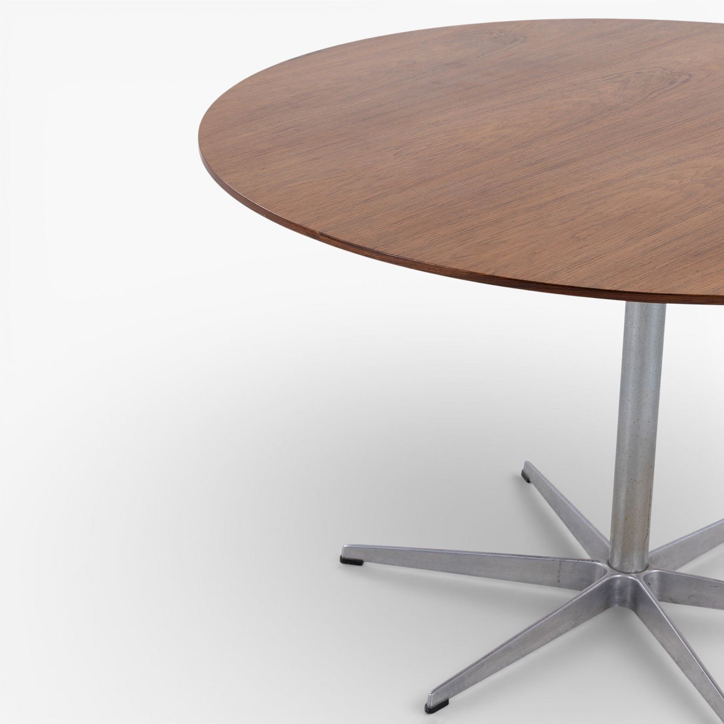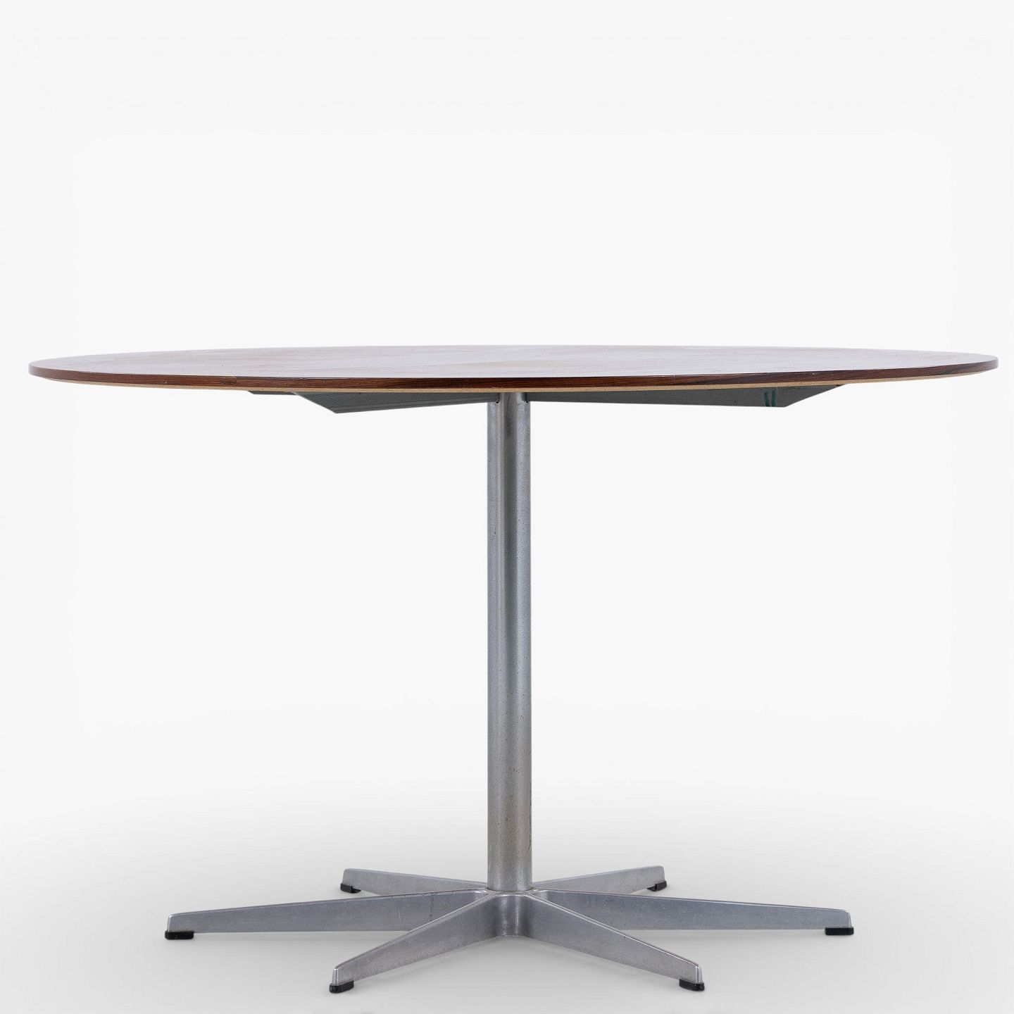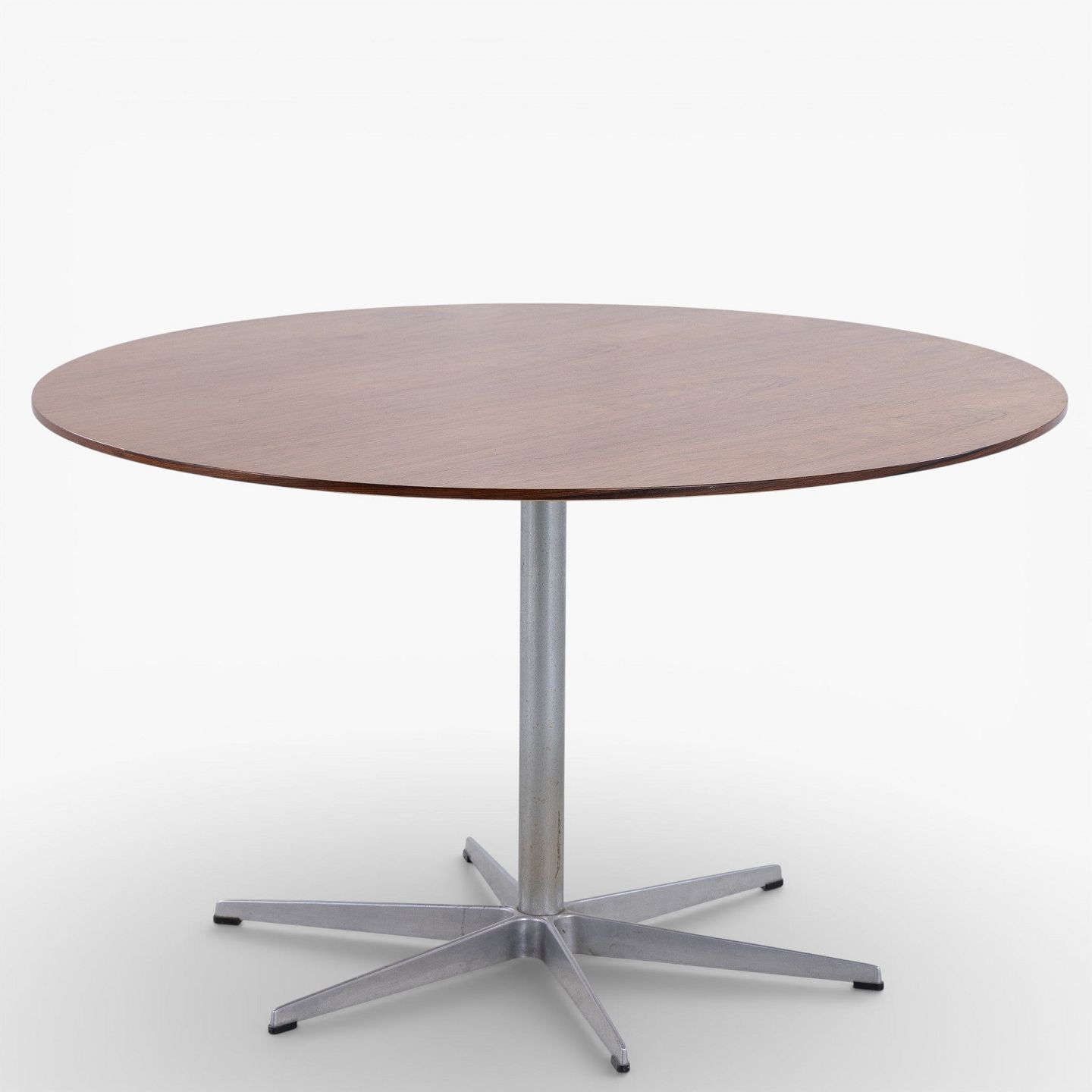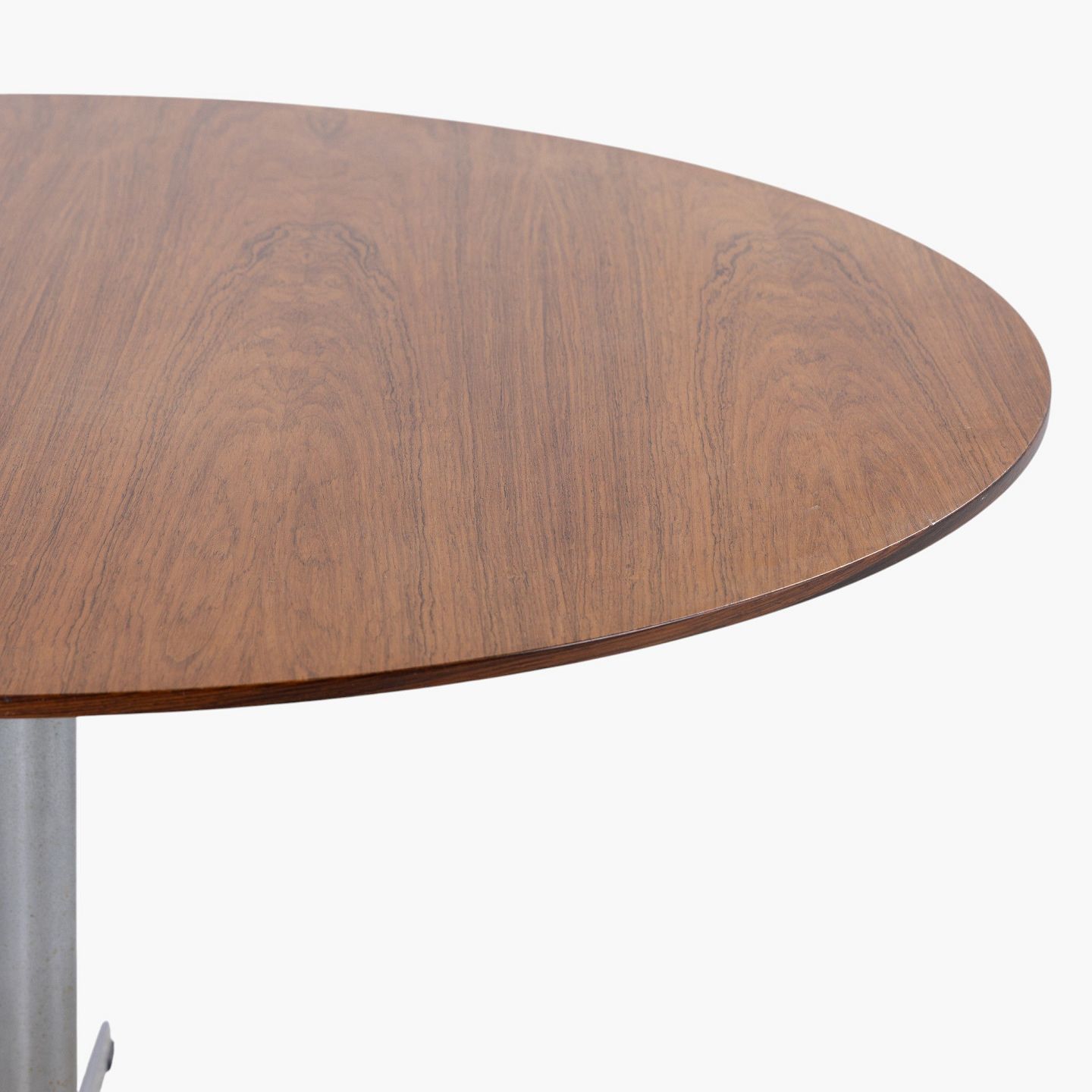 Spisebord med rund plade i palisander på seksfodet stel i stål.