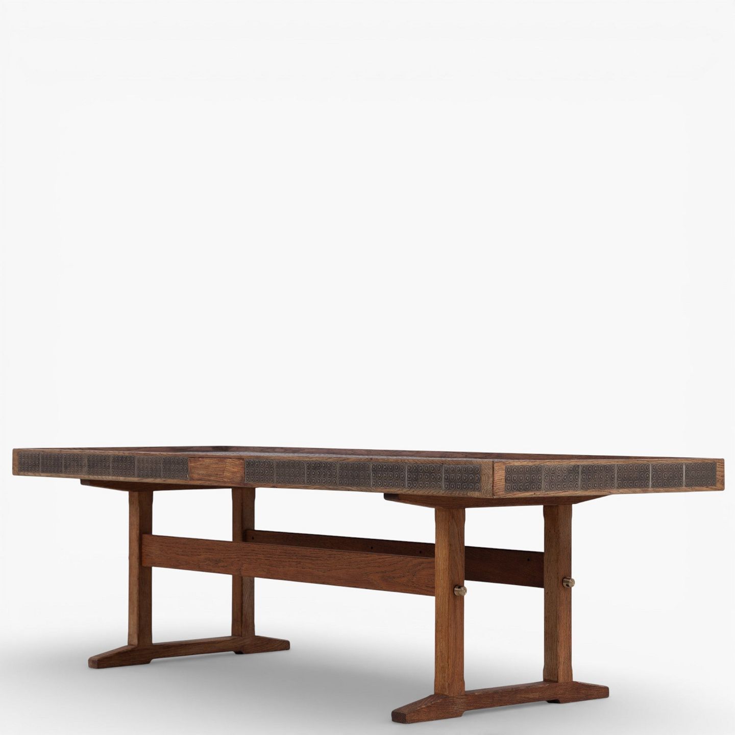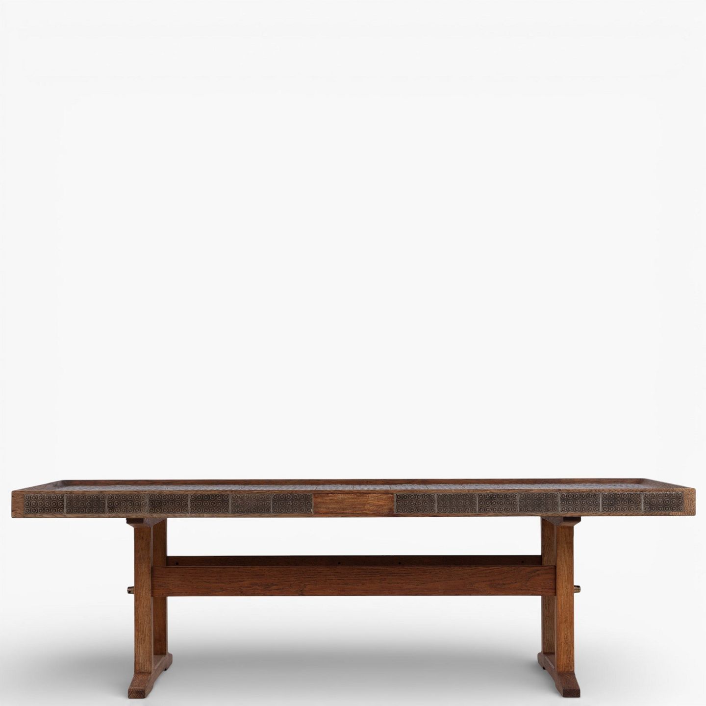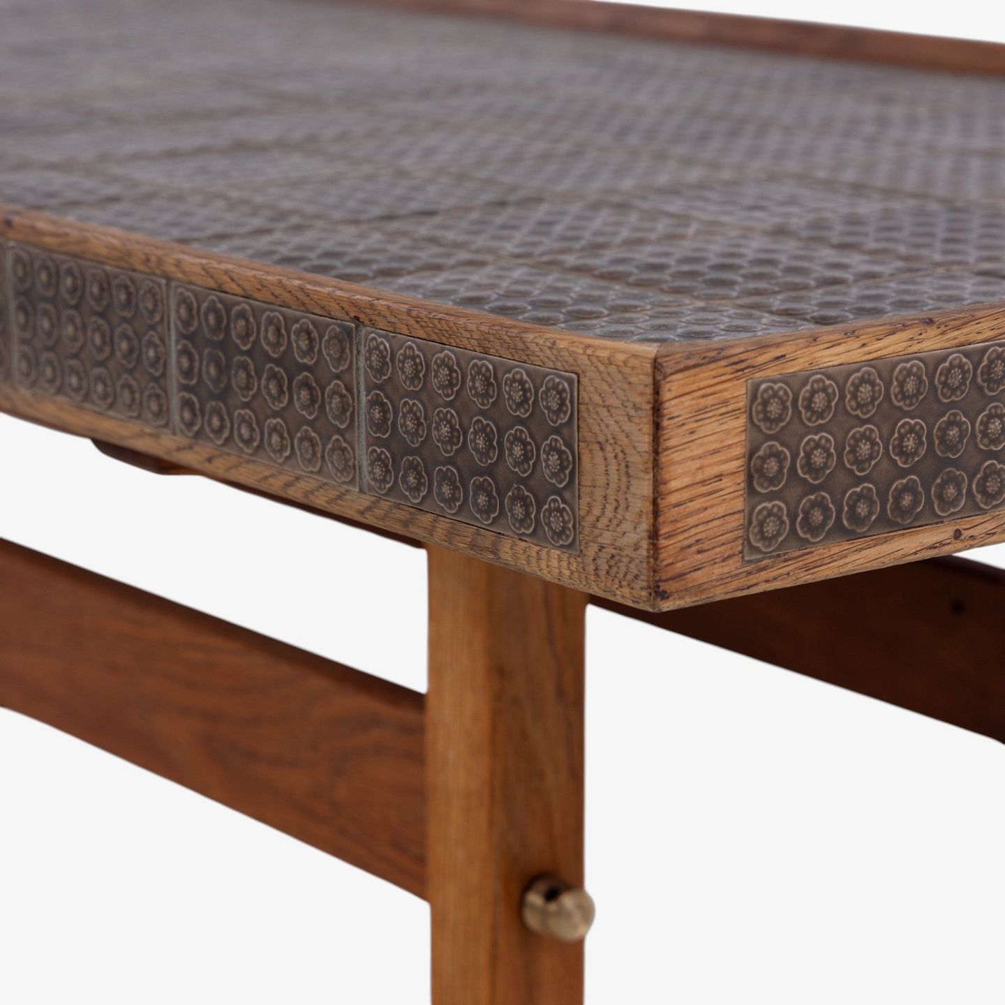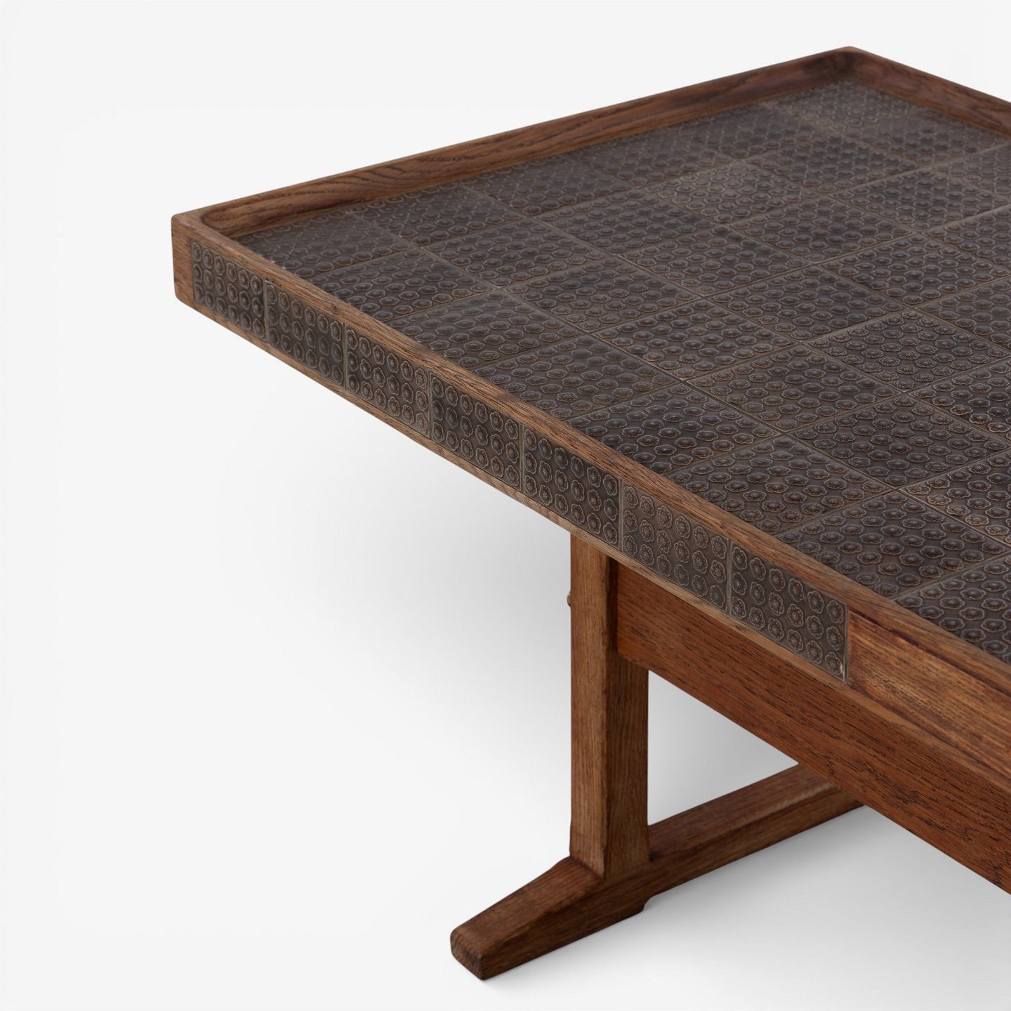 Sofabord i patineret egetræ dekoreret med brune kakler. Stemplet fra producent.