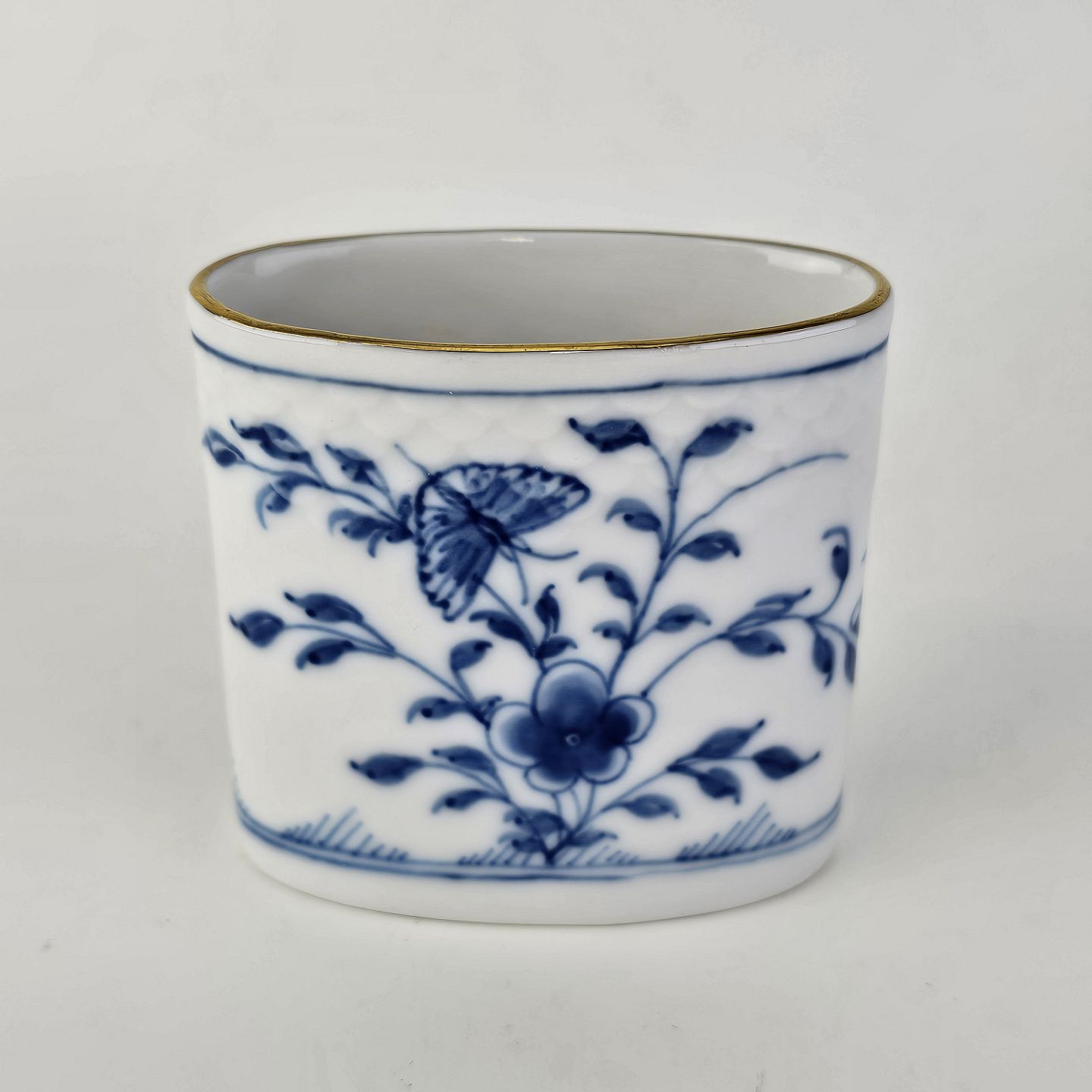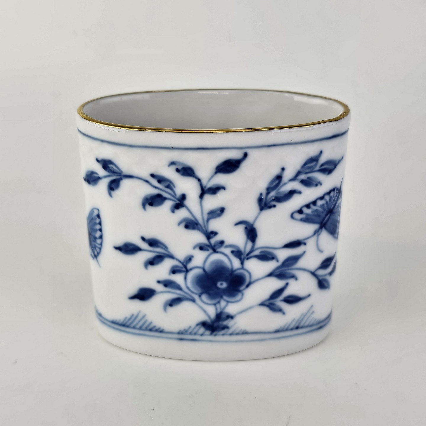 Stel i hvidt porcelæn med guldkant med blå motiver af blomster og sommerfugle.