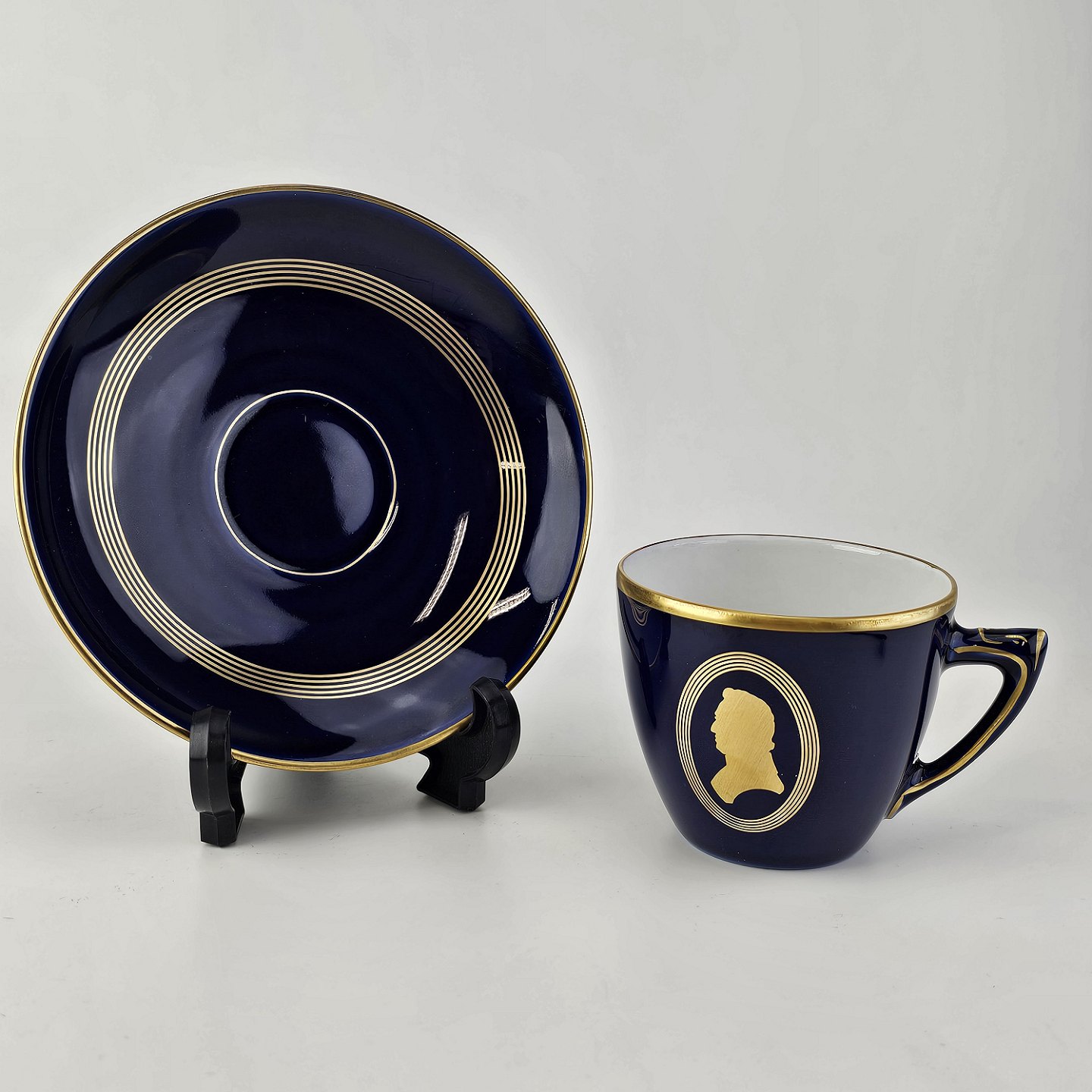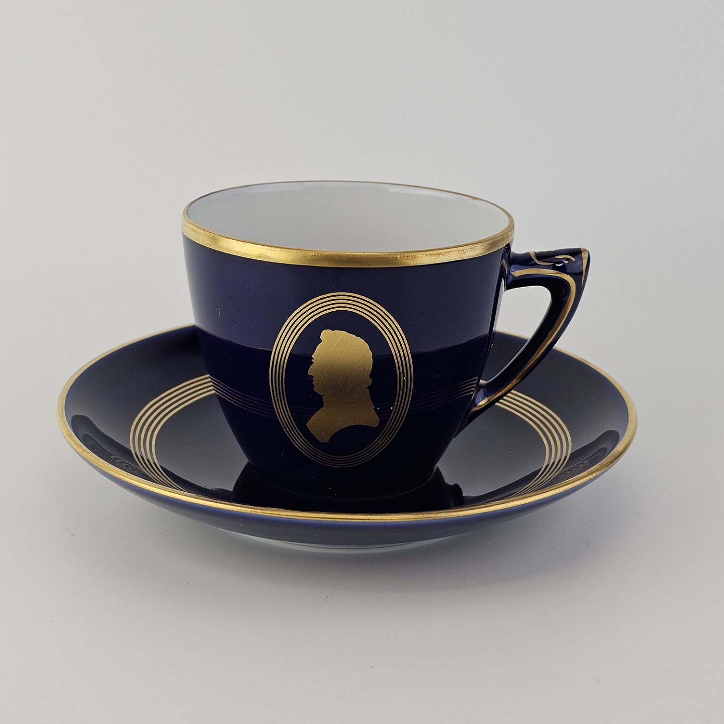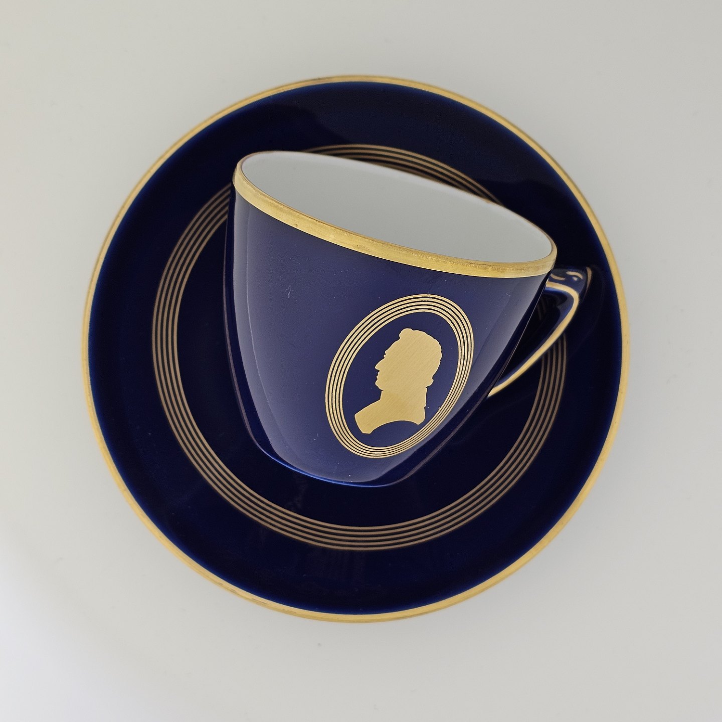 Komponist er blåt porcelæn med dekoration i guld i tema efter komponister