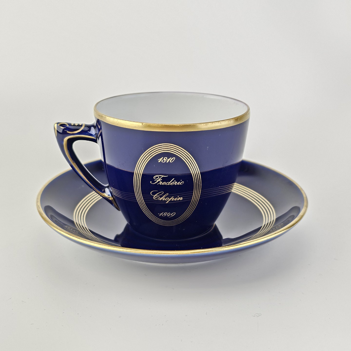 Kop med underkop i porcelæn fra stellet Komponist med motiv af Chopin