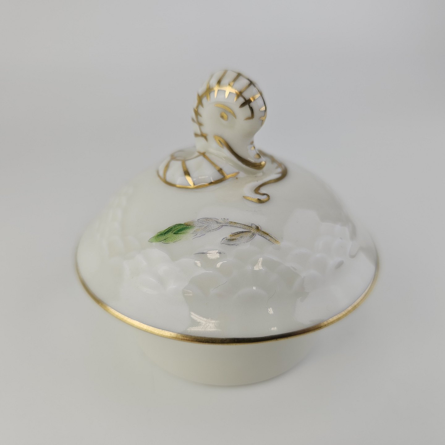 Frigga Anemone er cremefarvet porcelæn dekoreret med motiv af anemoner og bøgeløv med guldkant