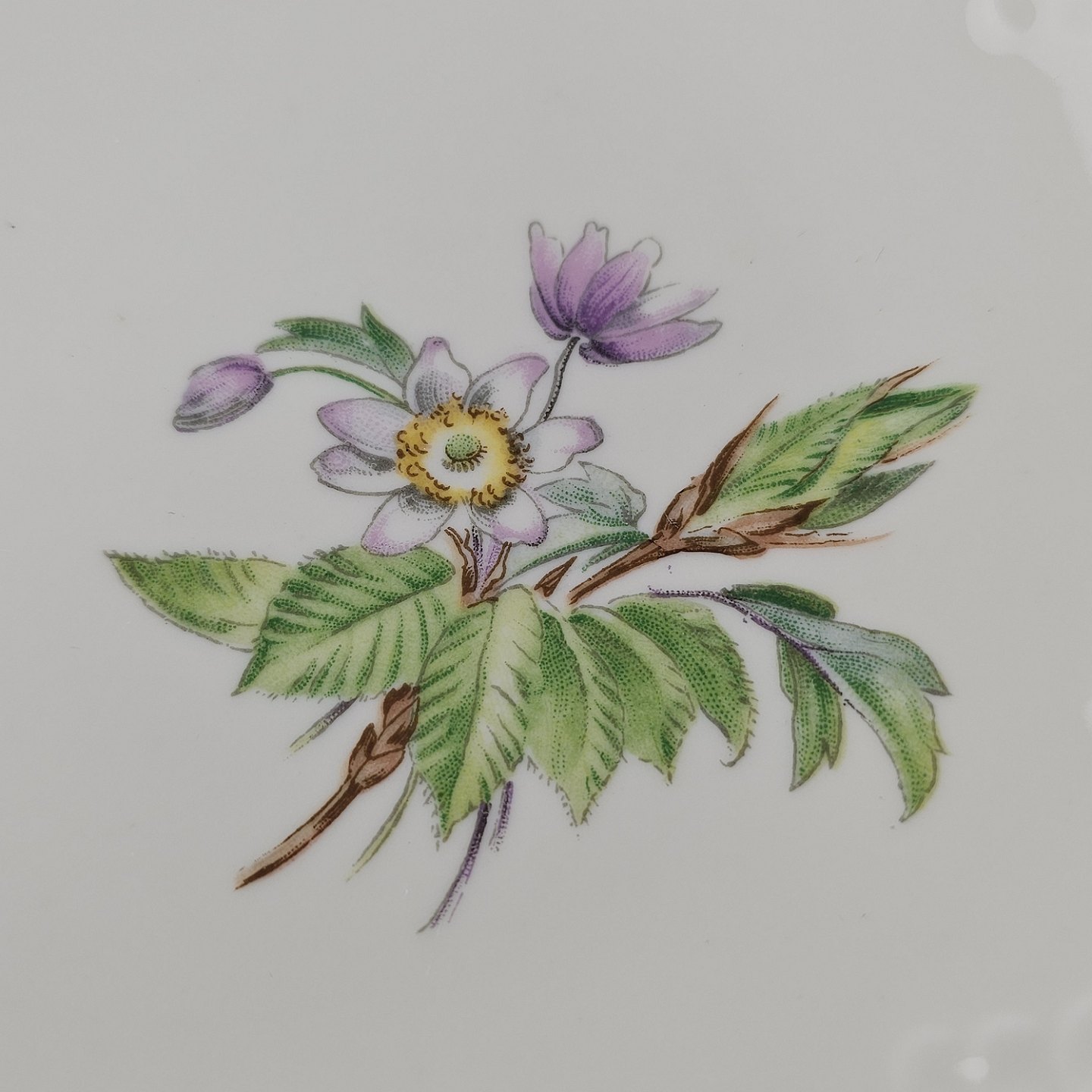Frigga Anemone er cremefarvet porcelæn dekoreret med motiv af anemoner og bøgeløv med guldkant