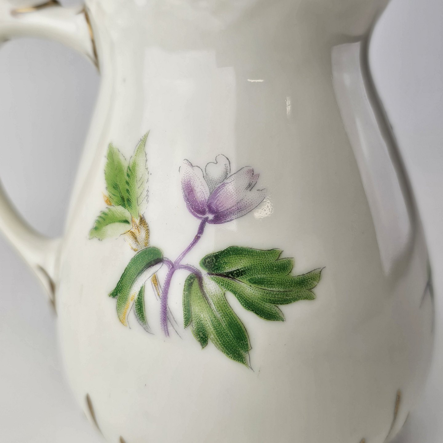 Frigga Anemone er cremefarvet porcelæn dekoreret med motiv af anemoner og bøgeløv med guldkant