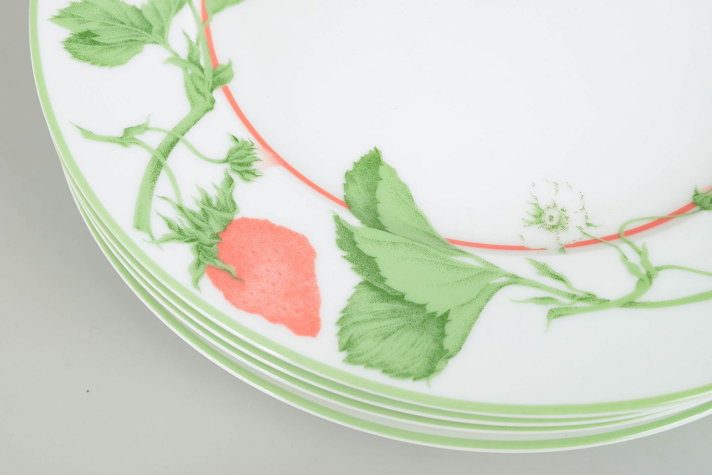 Sæt på fire store dækketallerkener i porcelæn med dekoration af jordbær og blade samt grøn og rød kant i serien Fraise.