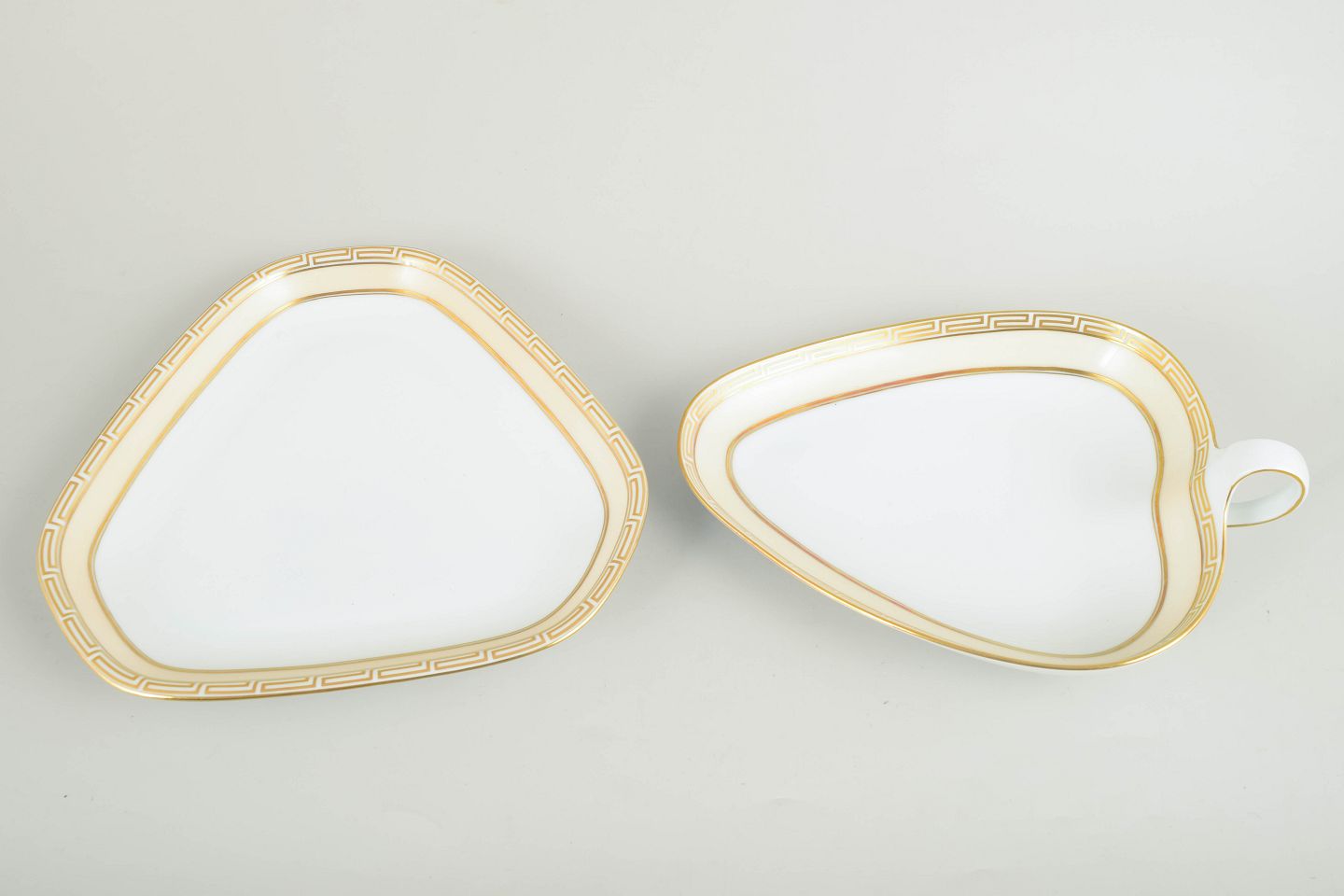 Sæt med to trekantede fade i hvidglaseret porcelæn med forgyldt kant og geometrisk bort i art deco-stil; modeller 354 og 357.