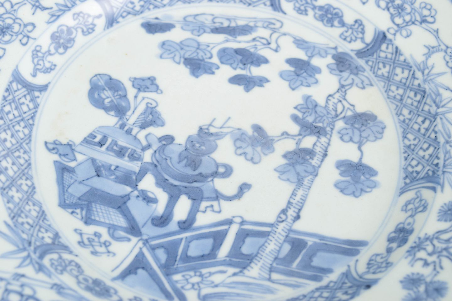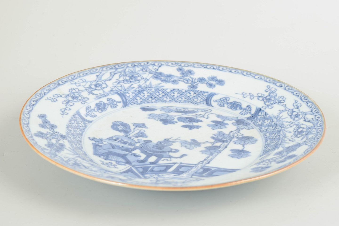 Chinese export porcelain of the 18th century was produced for the European market and is characterised by refined landscape scenes, floral decoration and a clear blue underglaze. Such plates were often part of larger services and reflect the interaction between Chinese ceramic traditions and European taste of the period.