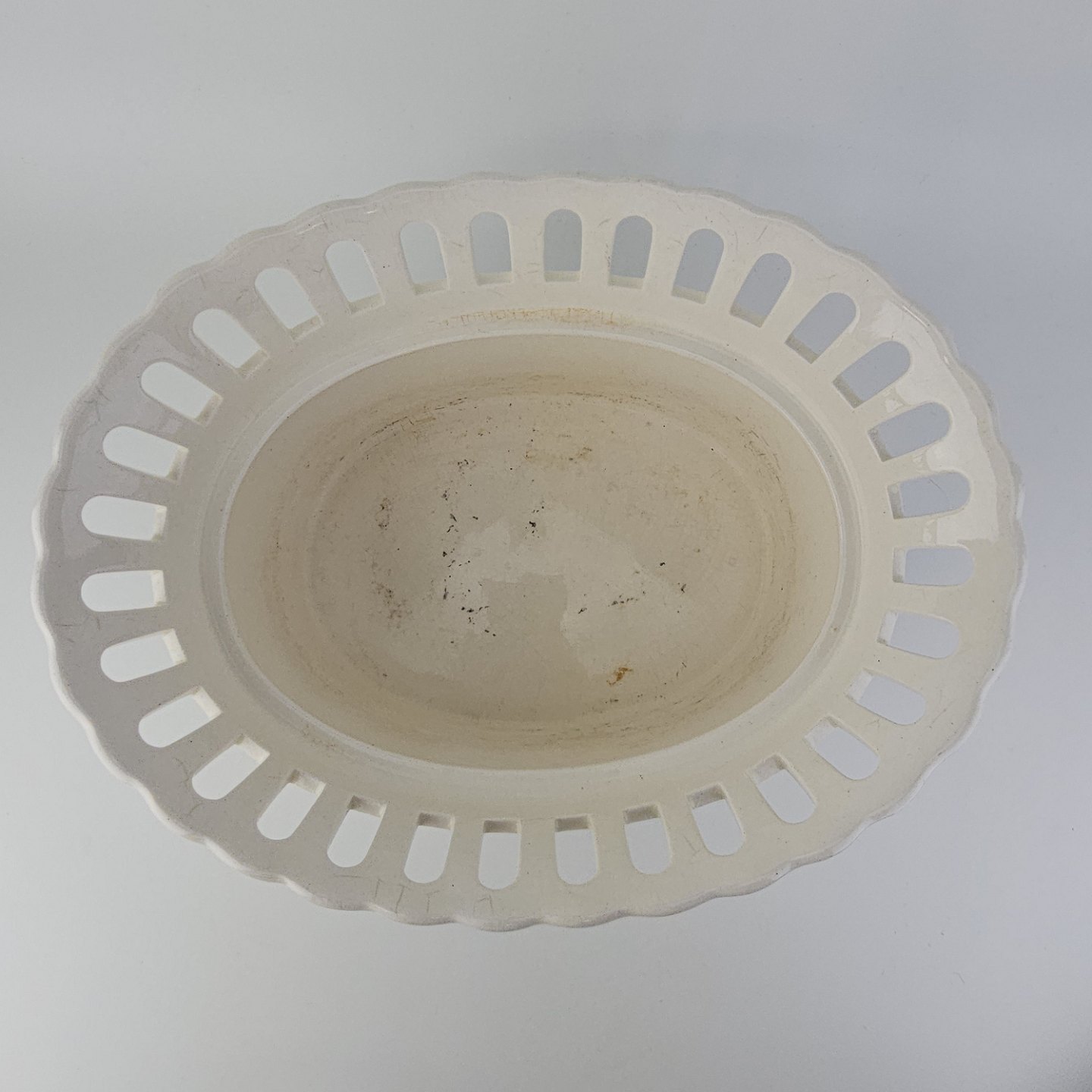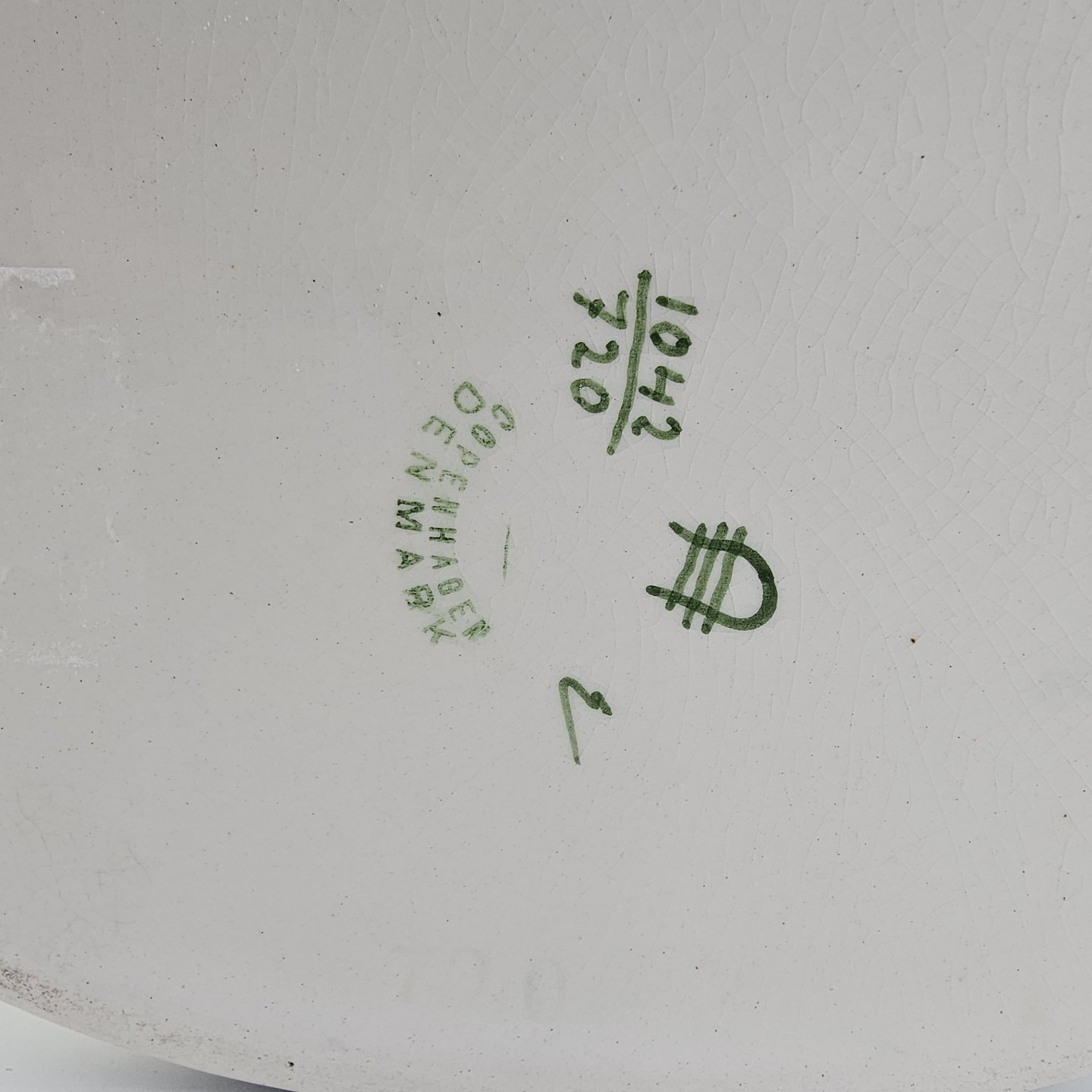 Oval jardiniere med låg i fajance med dekoration af en blå blomst og grønne blade. Nr. 1042/720
