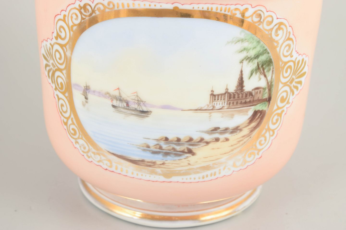 I 1800-tallet blev prospektporcelæn med motiver af kendte bygninger og landskaber populært i Danmark, ofte som erindringsgenstande eller dekorative interiørobjekter. Kronborg Slot var et hyppigt anvendt motiv på grund af sin nationale betydning og arkitektoniske fremtoning. Håndmalede vaser som denne kombinerer romantisk landskabsskildring med dekorativ porcelænskunst og afspejler periodens interesse for historie, topografi og national identitet.