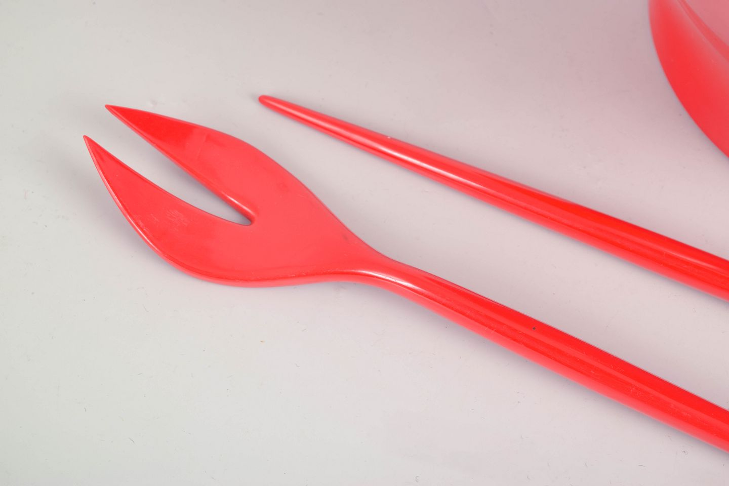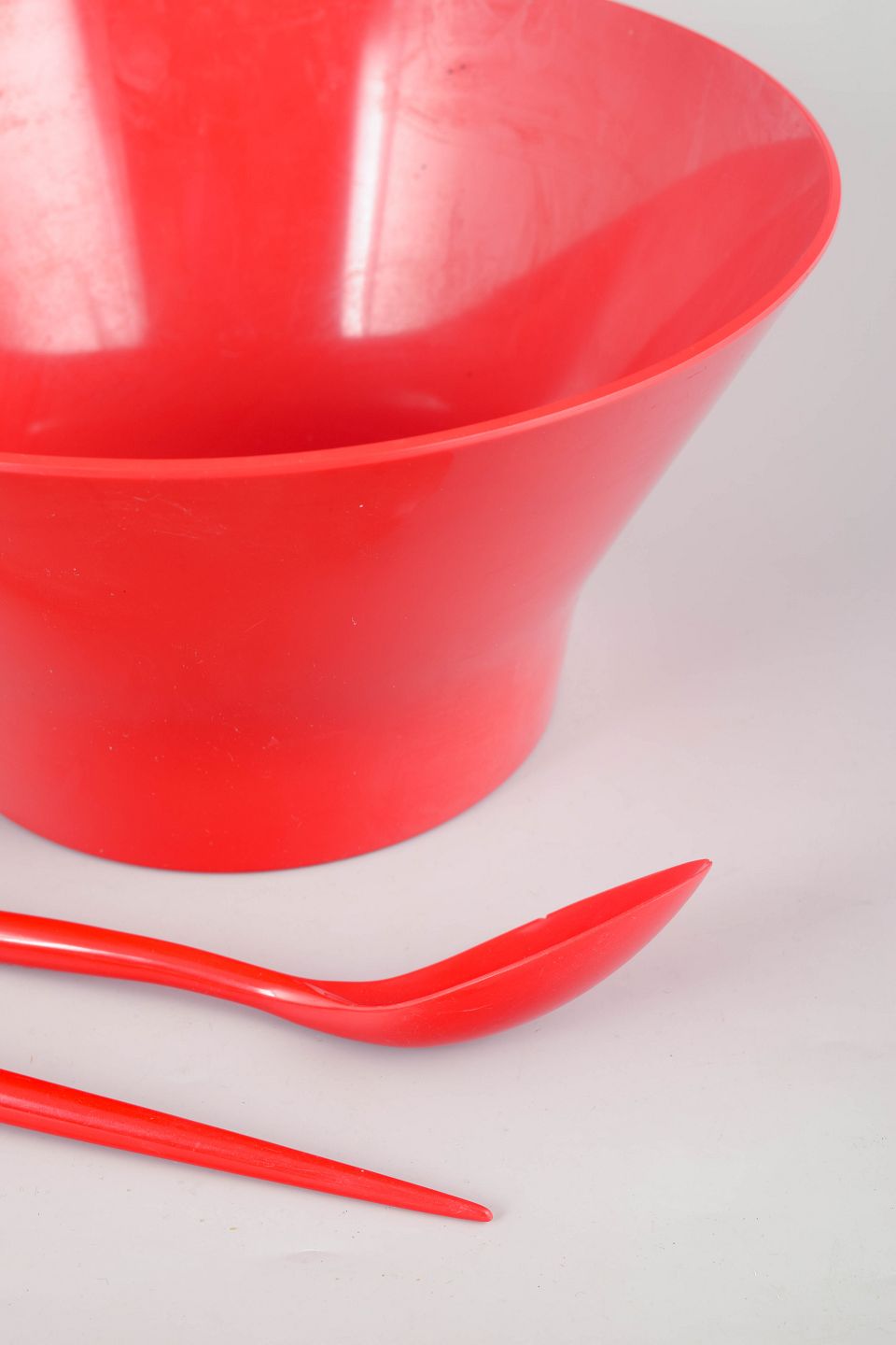 Organisk formet salatskål i rød plast med matchende serveringsske og -gaffel. Stemplet på undersiden “T. Ørskov & Co” samt H.K. Design Denmark”.