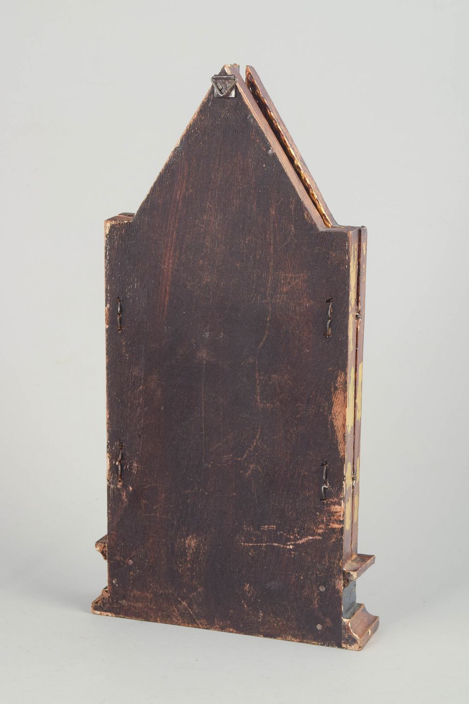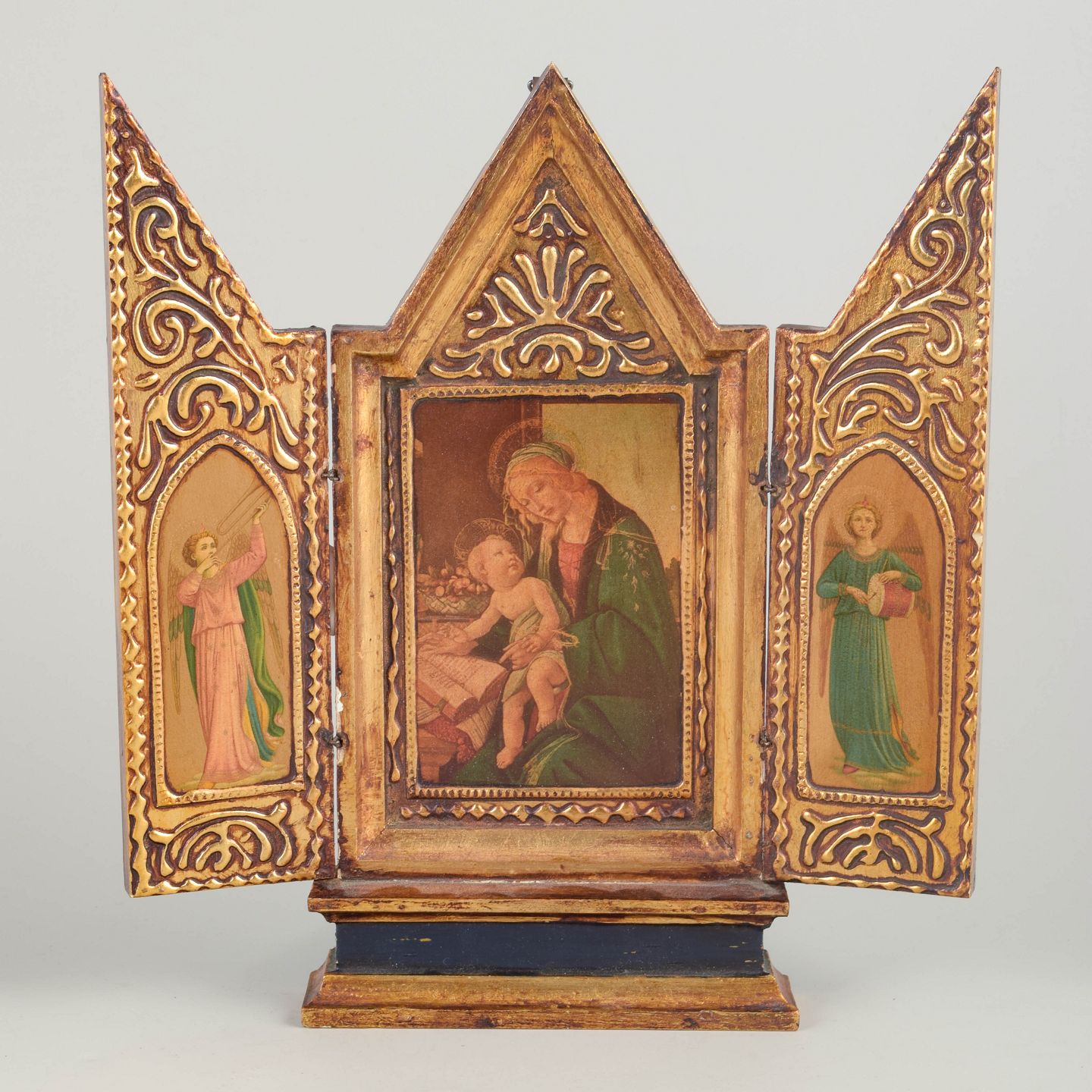 Foldbart triptykon med centralt ikonmotiv af Madonna med Barn, flankeret af helgenfigurer på sidefløjene. Udført som maleri på træ med forgyldt og ornamenteret ramme.