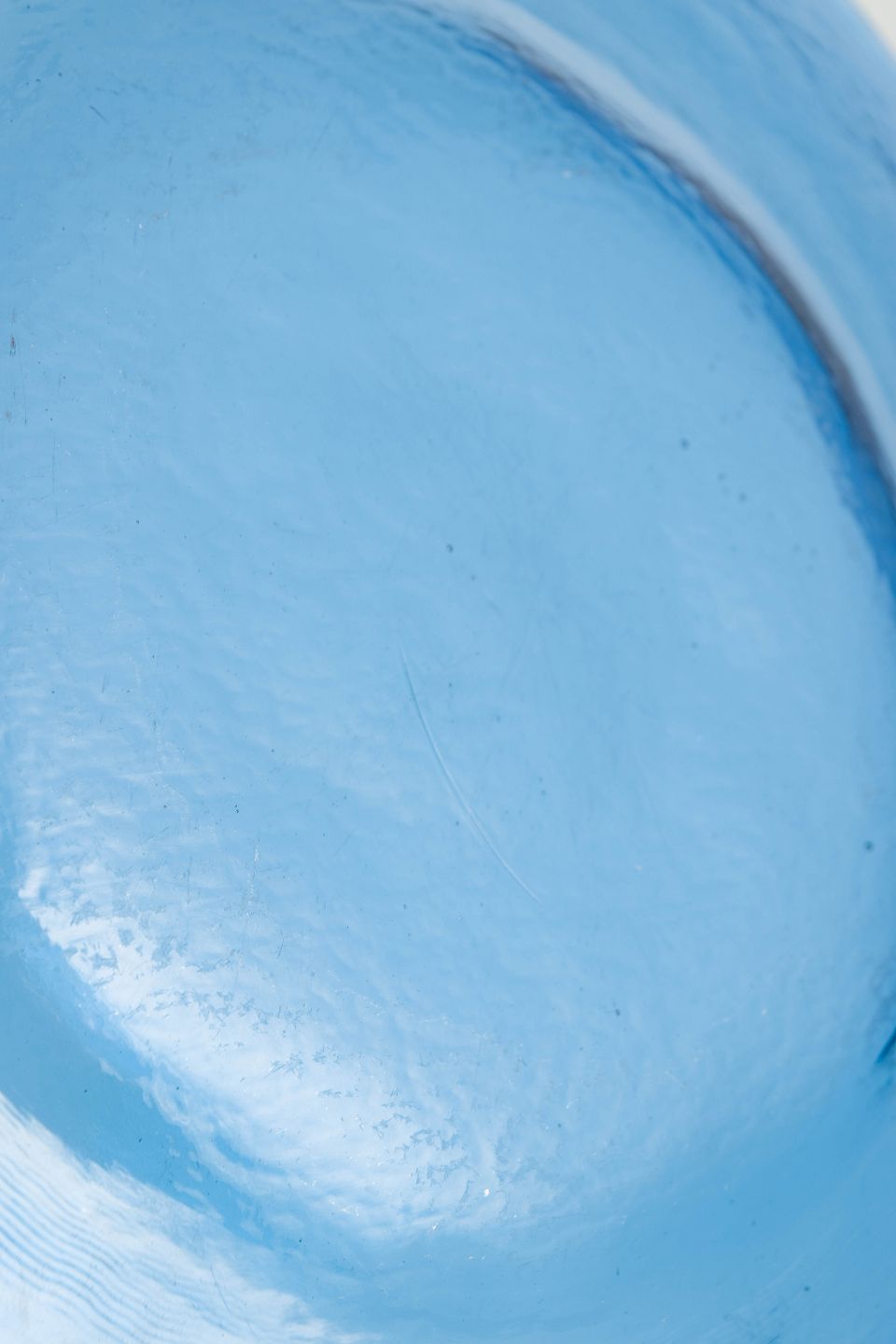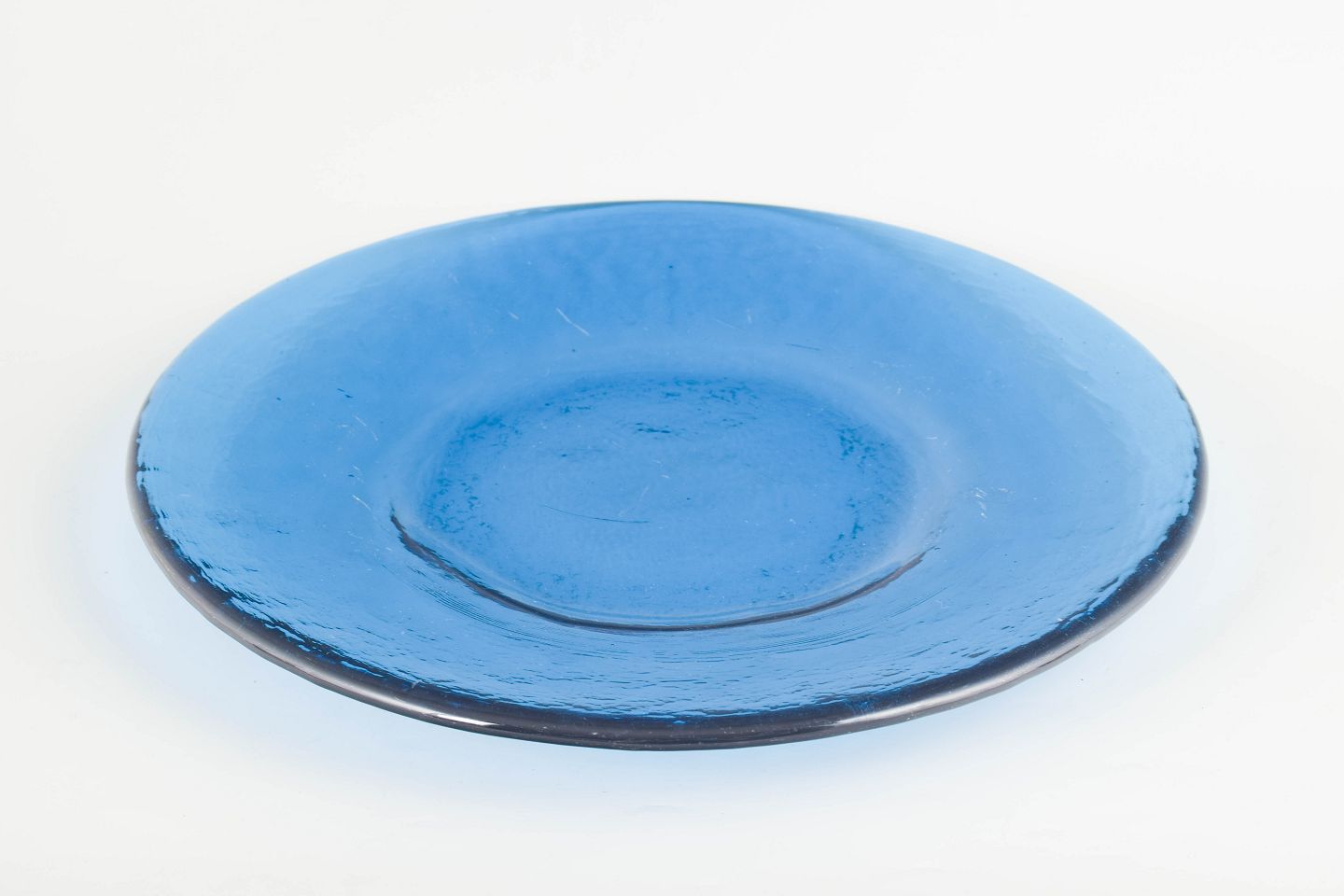 Stort svensk fad i kraftigt blæst kunstglas i blå tone med glat spejl og let ujævn rand, udført i et enkelt og funktionelt formsprog typisk for skandinavisk glasdesign fra midten af det 20. århundrede.