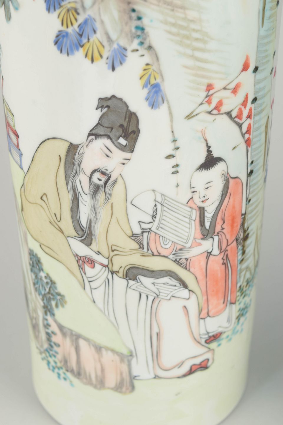 Kinesisk porcelæn fra 1800-tallet blev ofte udsmykket med fortællende figurscener kombineret med kalligrafiske indskrifter, der henviser til poesi, dannelse og naturmotiver. Samspillet mellem billedfelt, tekst og røde segl efterligner lærde malerier og giver genstandene et kultiveret og dekorativt udtryk.