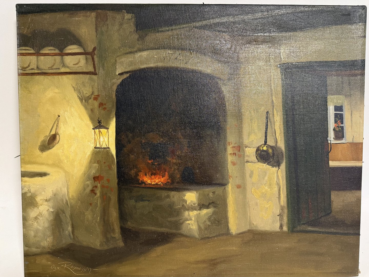 Osvald Rasmussen (1885-1972), Uindrammet maleri på lærred af interiører med ildsted / køkken fra 1747, signeret Osv Rasmussen, Mål 49x39cm.