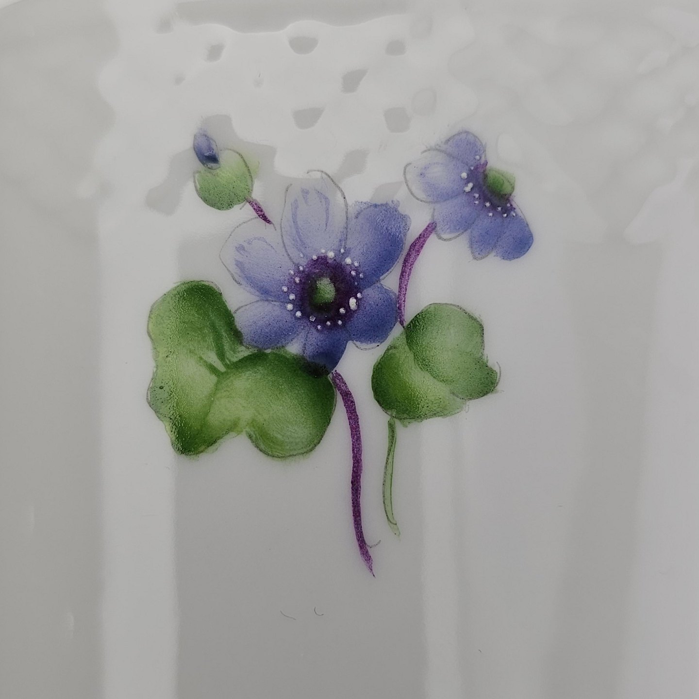 Antonius er af hvidt porcelæn med skælform dekoreret med håndmalede blå anemoner og guldkant