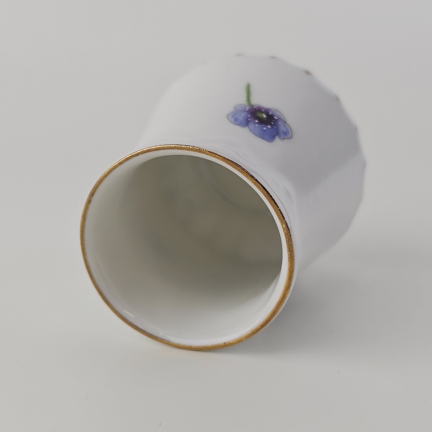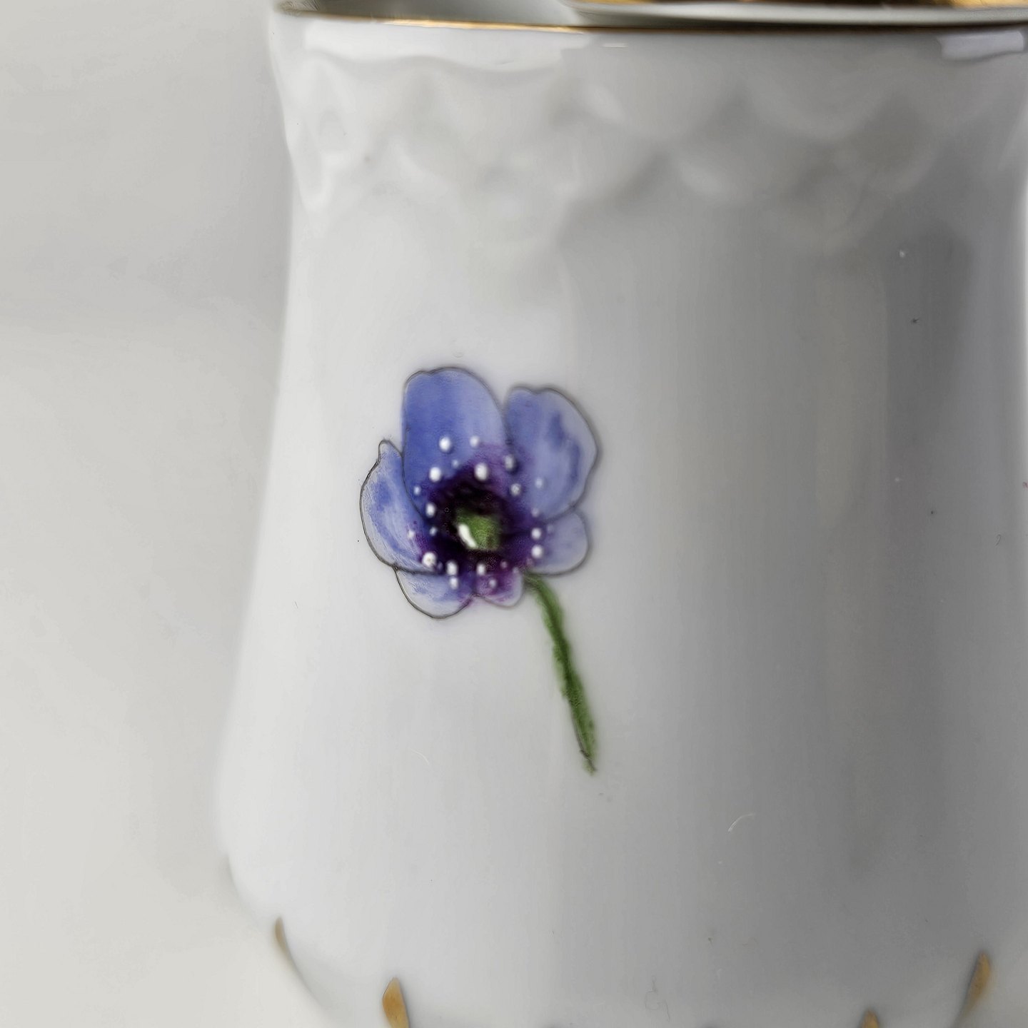 Antonius er af hvidt porcelæn med skælform dekoreret med håndmalede blå anemoner og guldkant. Også kendt under navnet Blå Anemone.