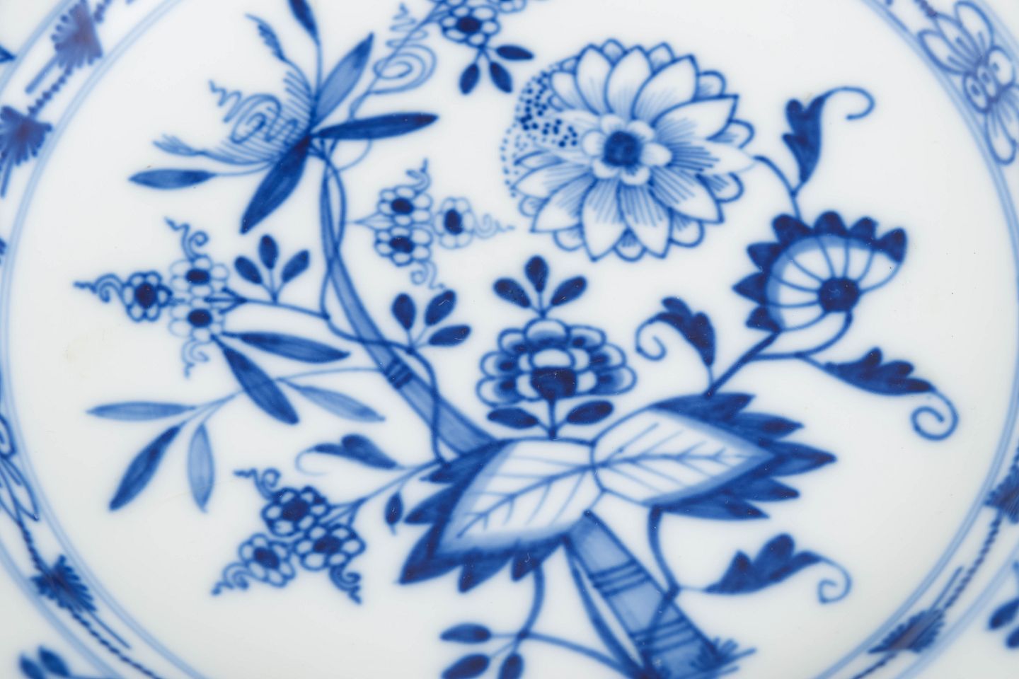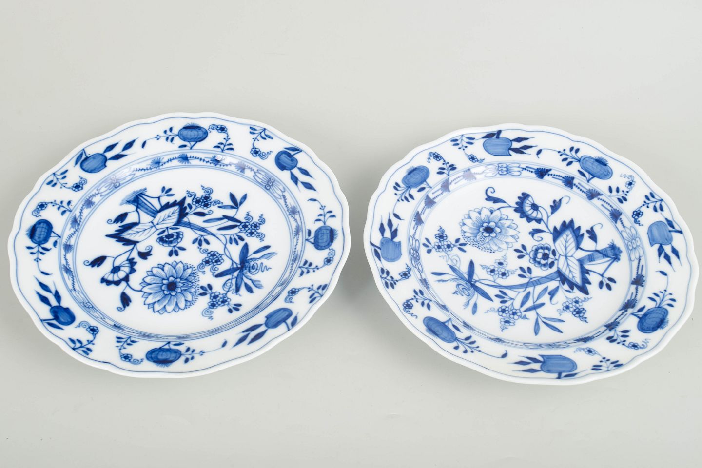 Middagstallerkener i hvidt porcelæn dekoreret i underglasur, løgmønster med bølget fane. Mærket i bunden med Meissens krydsede sværd.
