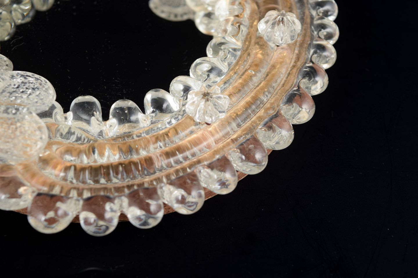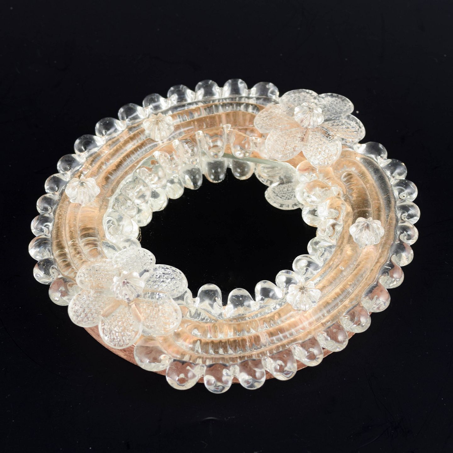Lille dekorativt vægspejl med ramme af håndformet Murano-glas i varme rosétoner og klart glas. Rammen er opbygget af påsatte blomster- og knopformer med rillet og boblet struktur, typisk for venetiansk glasdesign fra midten af det 20. århundrede. Spejlglasset er indfældet centralt i den plastiske glasramme.