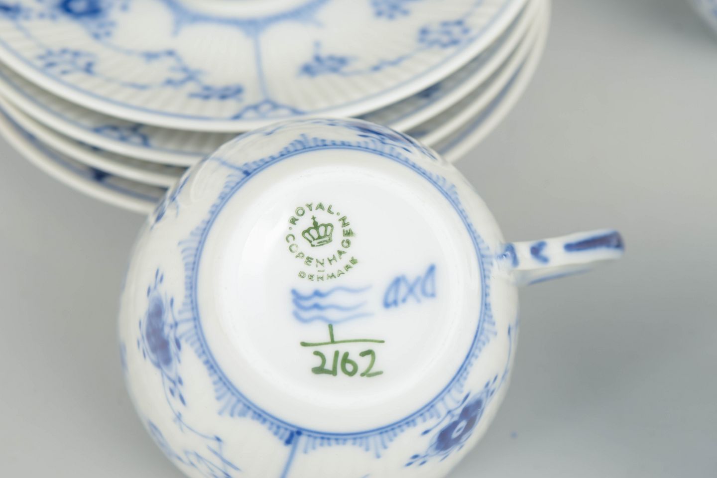 Musselmalet riflet er Royal Copenhagens ældste stel, introduceret i 1775. I 1960’erne blev stellet fortsat produceret med stor respekt for det traditionelle håndværk, hvor frihåndsmalet koboltdekoration og klassiske former blev fastholdt. Kaffekopper i denne periode afspejler den etablerede danske kaffekultur og stellets vedvarende rolle i både hverdags- og selskabelige sammenhænge.
