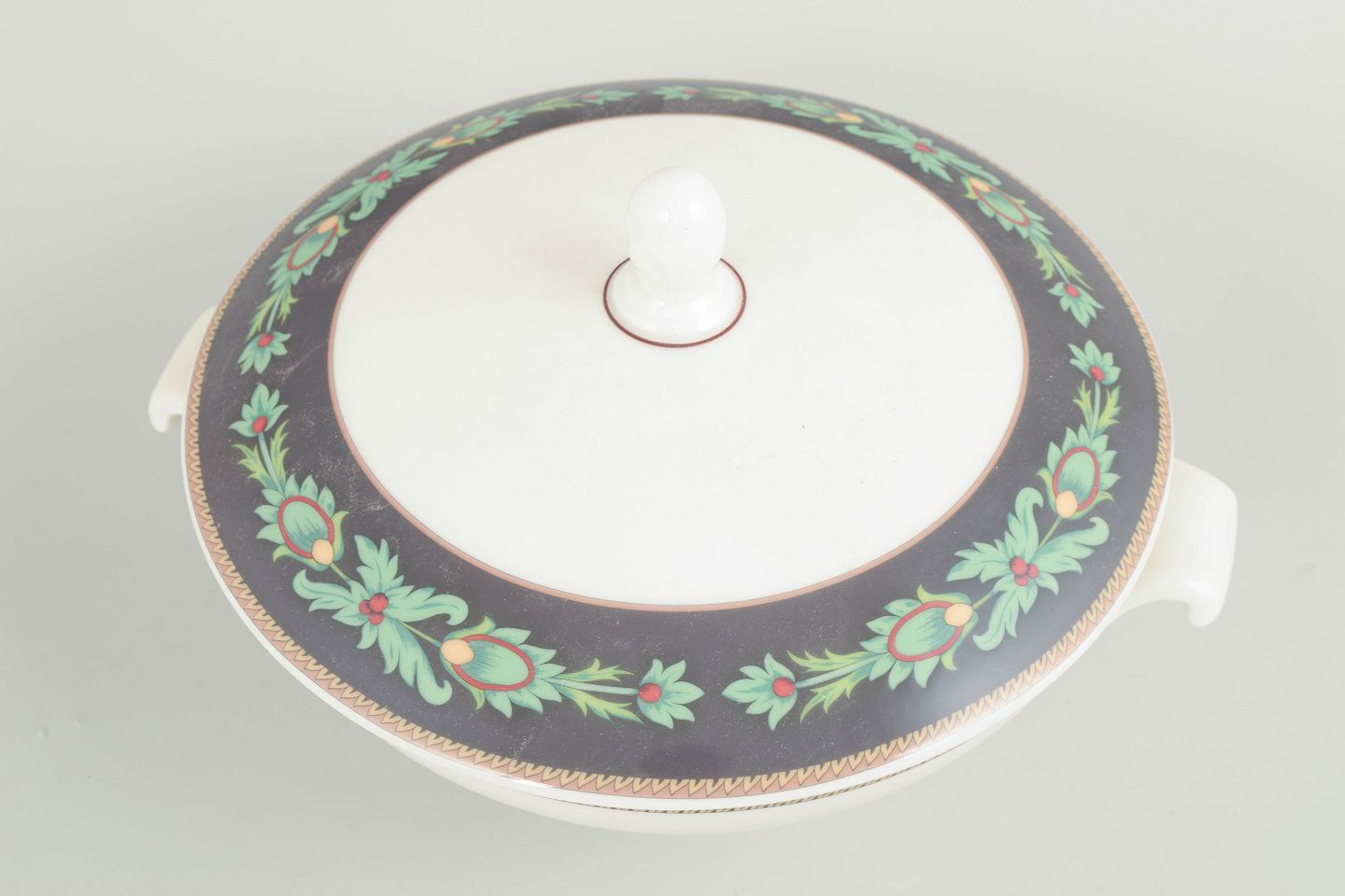 Terrin med låg i porcelæn fra Rosenthal Classic, dekoreret i serien Mayfair med mørk bort, stiliserede grønne bladranker og gulddetaljer, produceret i 1980’erne.