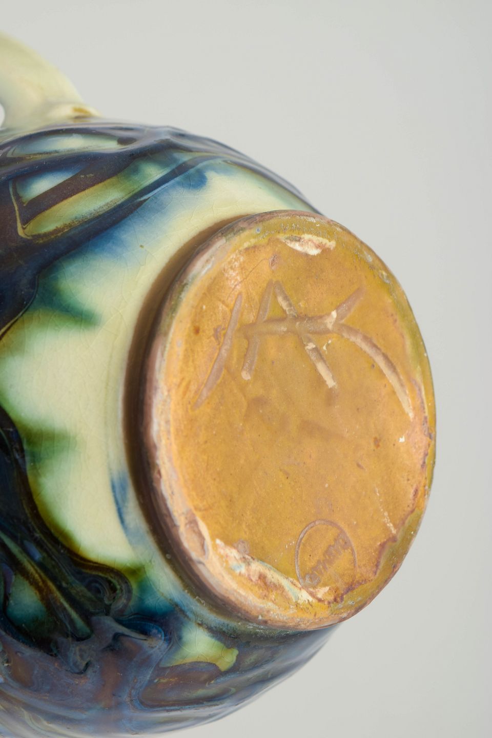 Kande i glaseret stentøj med markant reliefdekoration i form af stiliserede blad- og båndmotiver i blå og grønne nuancer på lys bundglasur. Formen er kraftfuld og balanceret med tydelig hank og hældetud, og dekorationen er integreret i godset som et plastisk element, der giver et levende samspil mellem form og overflade.