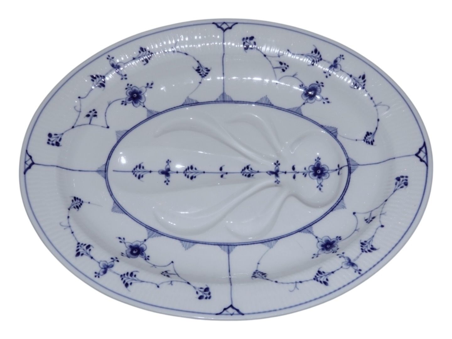 Royal Copenhagen Musselmalet Riflet, stort og sjældent fad til en steg, hvor kødsafterne kan løbe ned i fordybningerne.