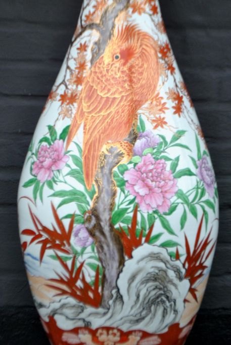 Japansk Kutani vase, 19. årh. Håndmalet. Dekoreret med bl.a. træer, blomster og fo fugl. Polykrom dekoration med forgyldninger. Bølget kant. H: 94 cm. Dia: 33,5 cm. H. inkl. fod: 113,5 cm.