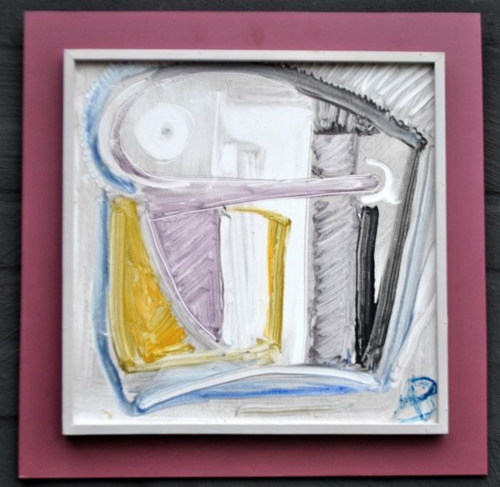 Brügger, Ane (1908 - 1995) Danmark: Komposition. Keramik flise bemalet i gult, lilla, blåt og grå nuancer. Signeret: AB. H: 32,5 cm. B: 32,5 cm.