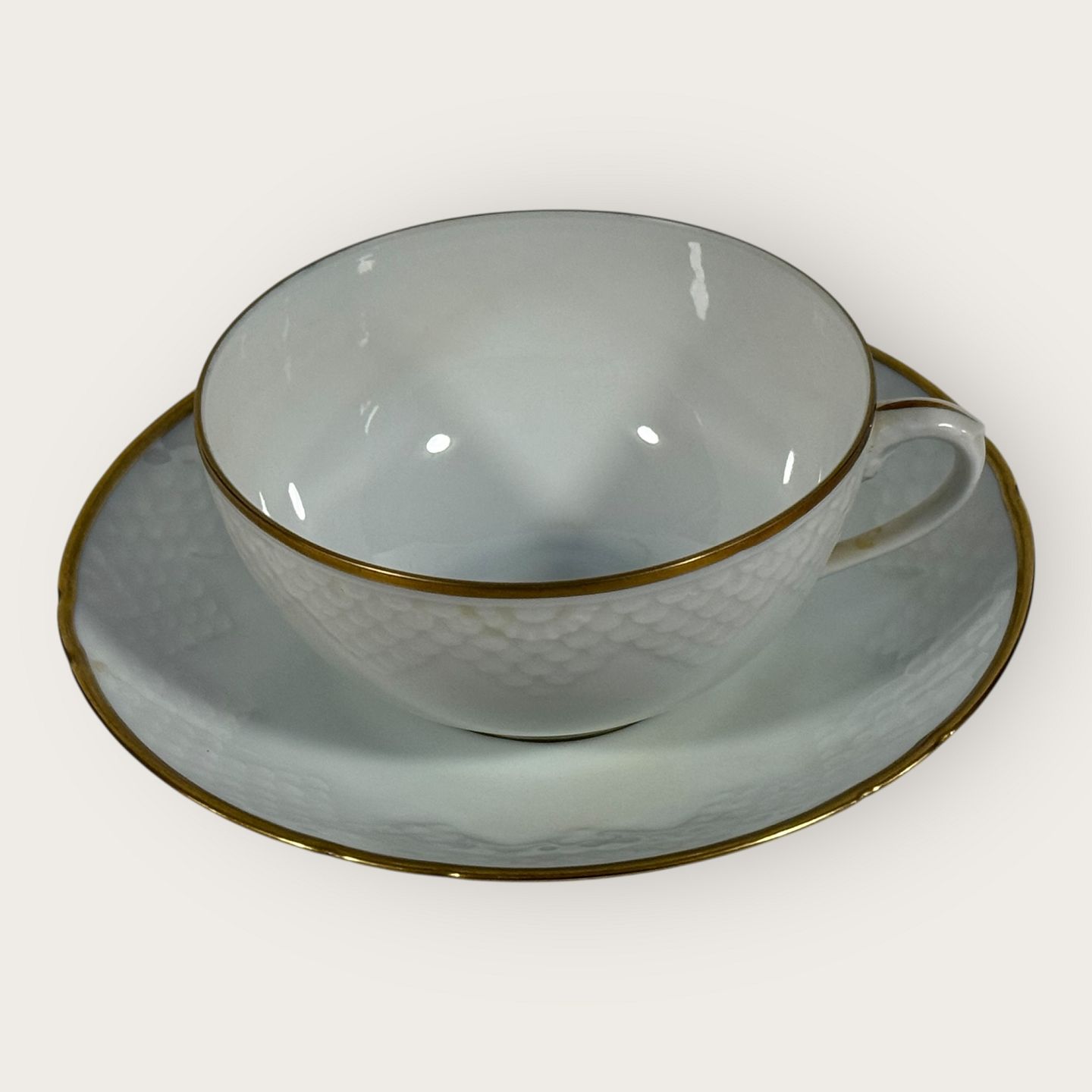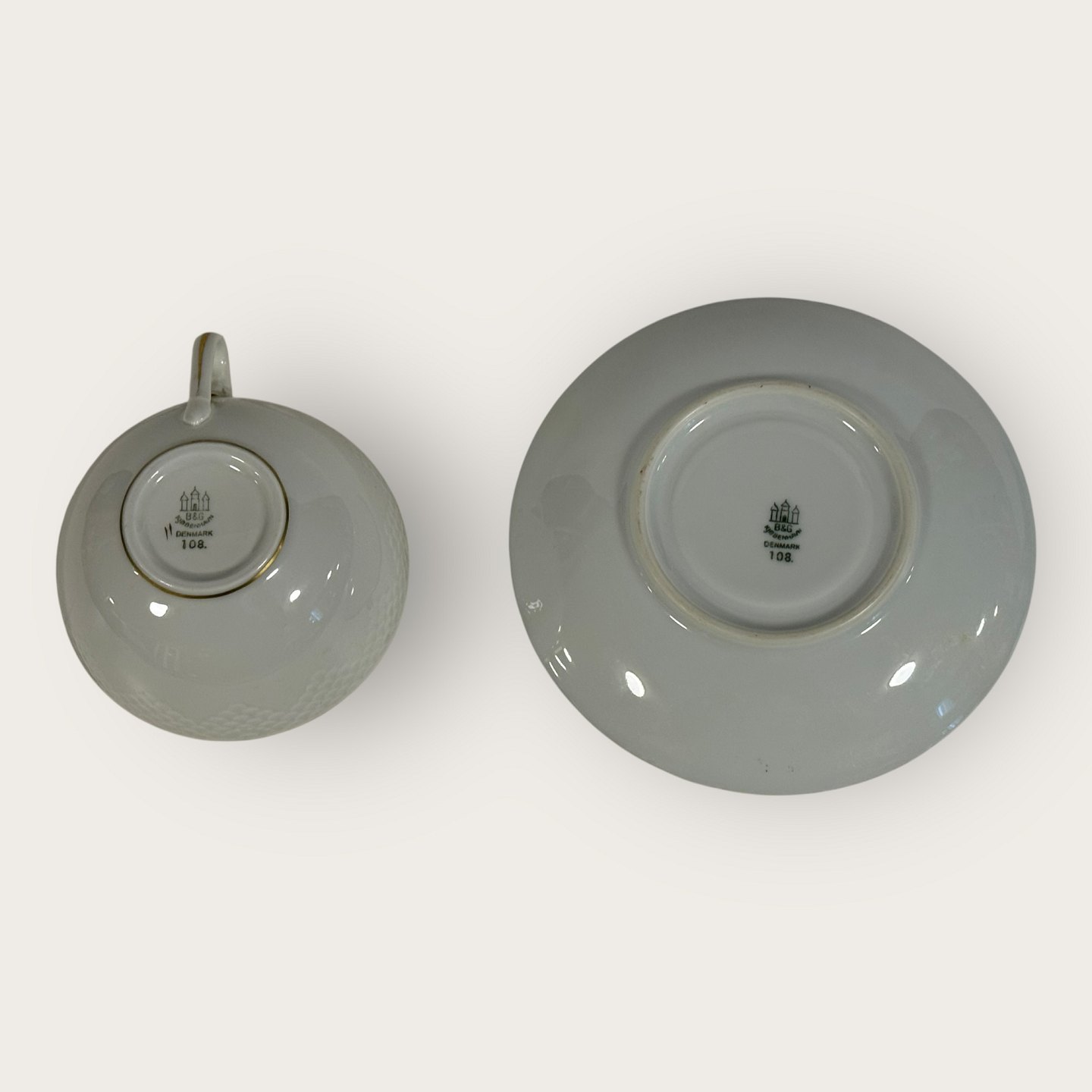 | Bing & Grøndahl, Aakjær, Hvid porcelæn med guldkant, Tekop sæt #108, 5cm høj, 10cm i diameter, 1.sortering *Pæn stand*