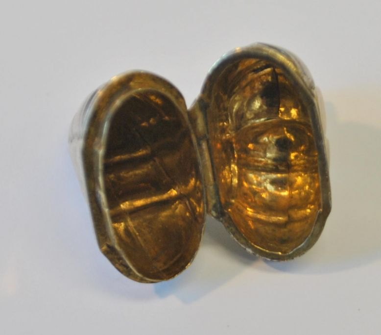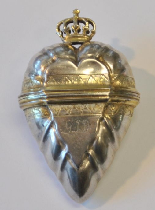 Thomas Andreas Westrup (ca. 1727 - 1814) København, Danmark: Hjerteformet hovedvandsæg med krone. På standfod. Indvendig lueforgyldt. Stemplet indvendig i låg. Udvednig med forgyldninger og graveringer, Med indgravering: G. J. D. Højde: 7 cm.