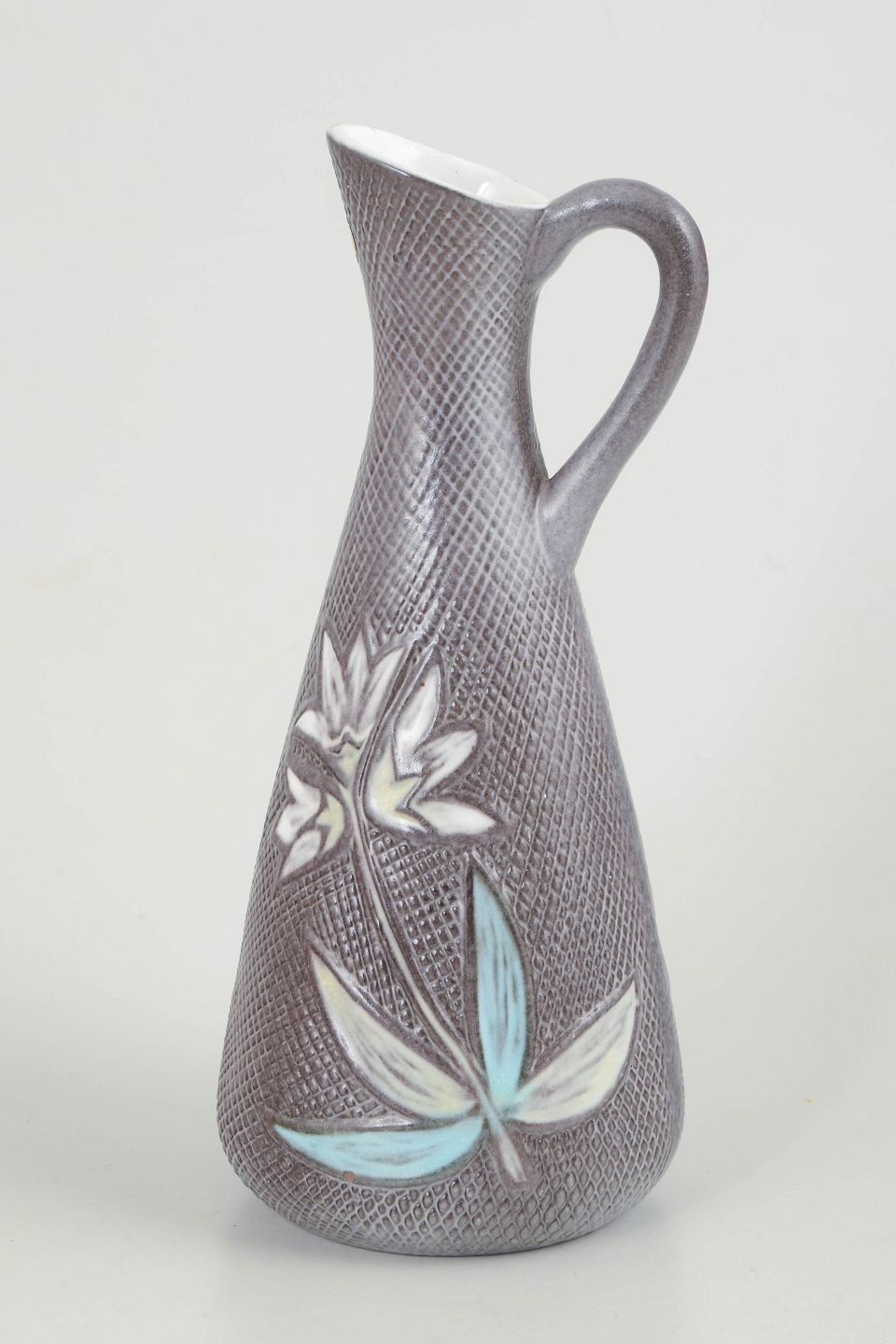 Elegant kande i stentøj med gråviolet, fint tekstureret overflade og reliefdekoration med stiliserede blade i lyse turkise og hvide toner. Organisk, slank form med integreret hank. Modellen er stemplet i bunden og bærer modelnummer 4499.