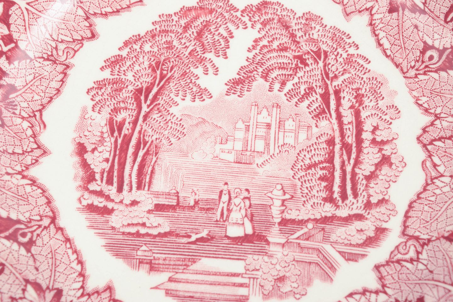 Sæt i fajance bestående af tallerkener og skål, dekoreret i rød transferware med landskabs- og ornamentmotiver fra forskellige engelske producenter, herunder Mason’s.