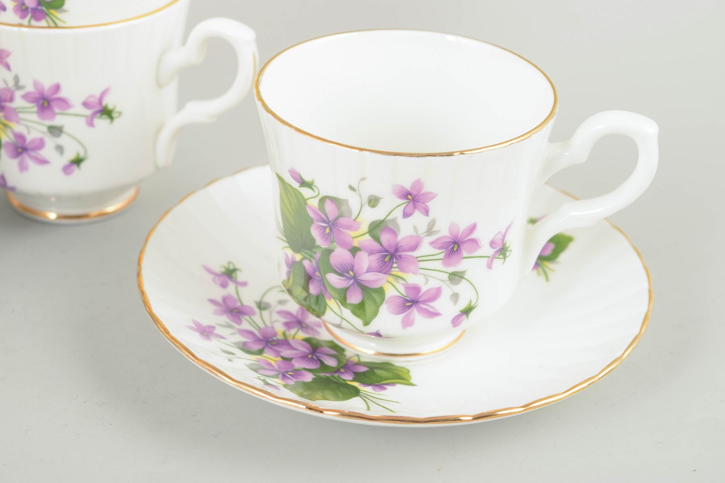 Sæt på fem kaffekopper og tilhørende underkopper i benporcelæn, dekoreret med violette blomster og grønne blade samt guldkant. Fremstillet af Royal Stafford, England.