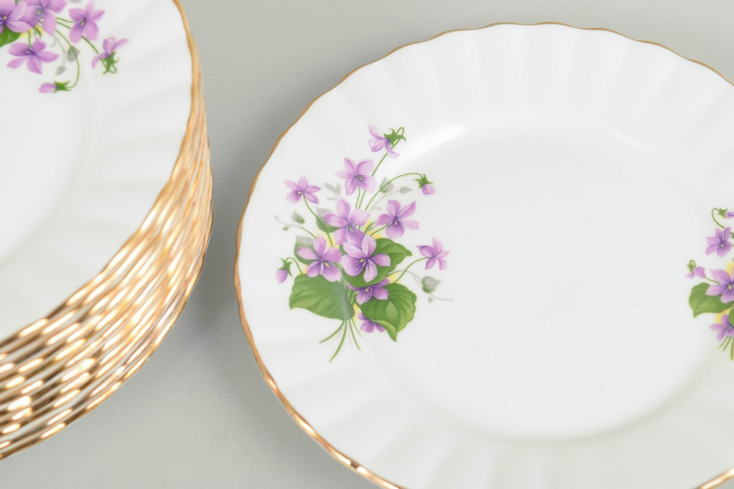 Sæt med tolv kagetallerkener i "bone china", dekoreret med fine lilla blomsterbuketter og forgyldt kant. Klassisk engelsk porcelæn med let relief og elegant, tidstypisk udtryk.