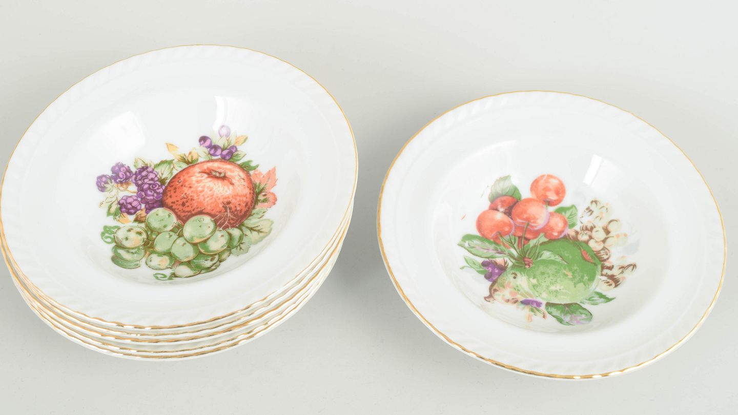Europæisk bordporcelæn fra 1930’erne kombinerer ofte klassiske former med dekorative motiver som frugt og forgyldning. Perioden afspejler en balance mellem traditionelt håndværk og samtidens stilretninger, hvilket resulterede i funktionelle og dekorative genstande til både hverdagsbrug og selskab.