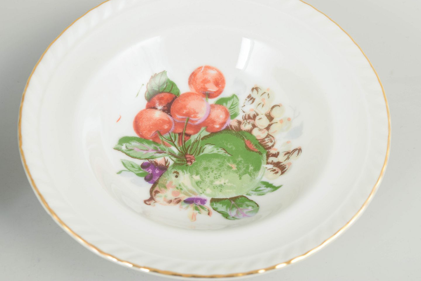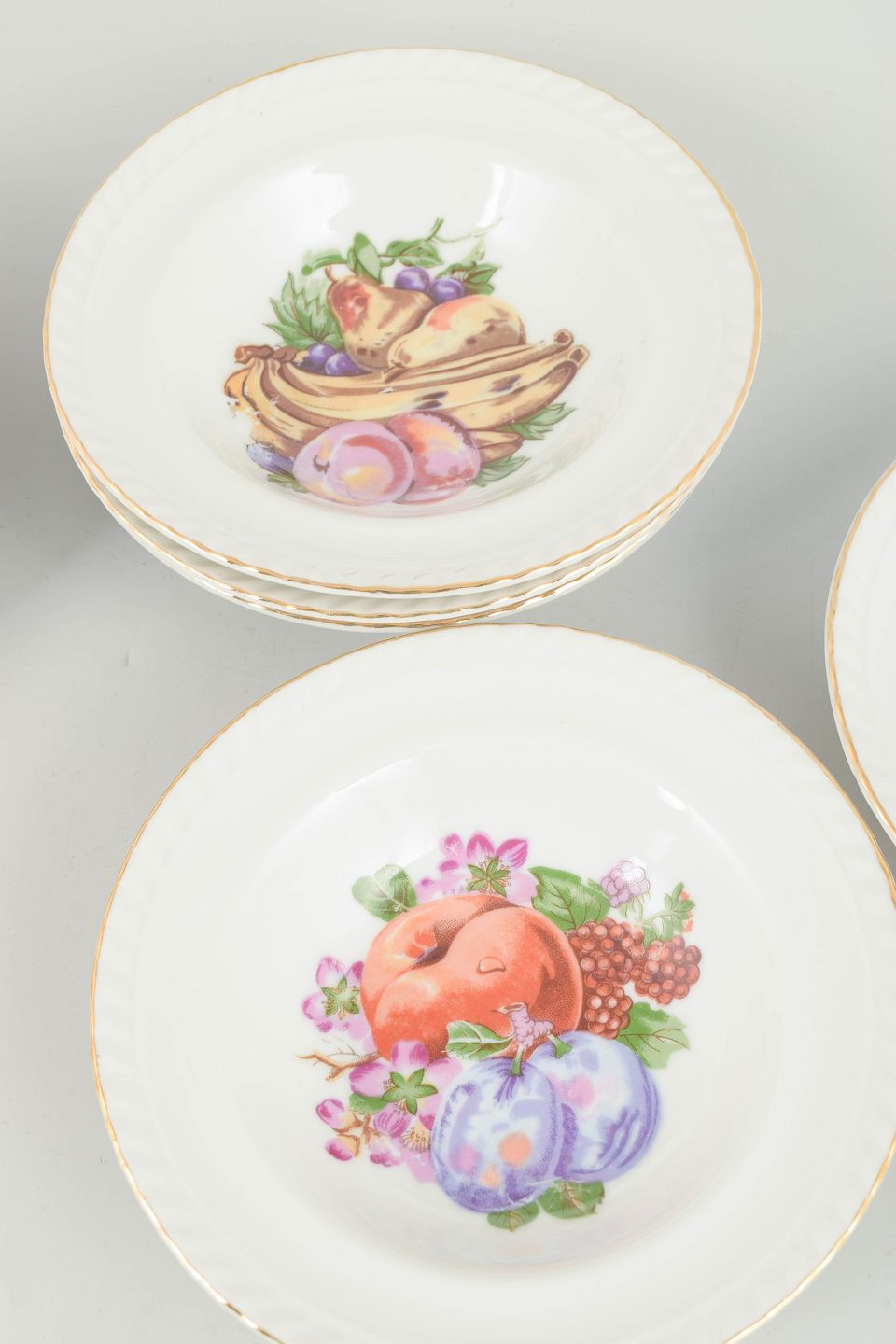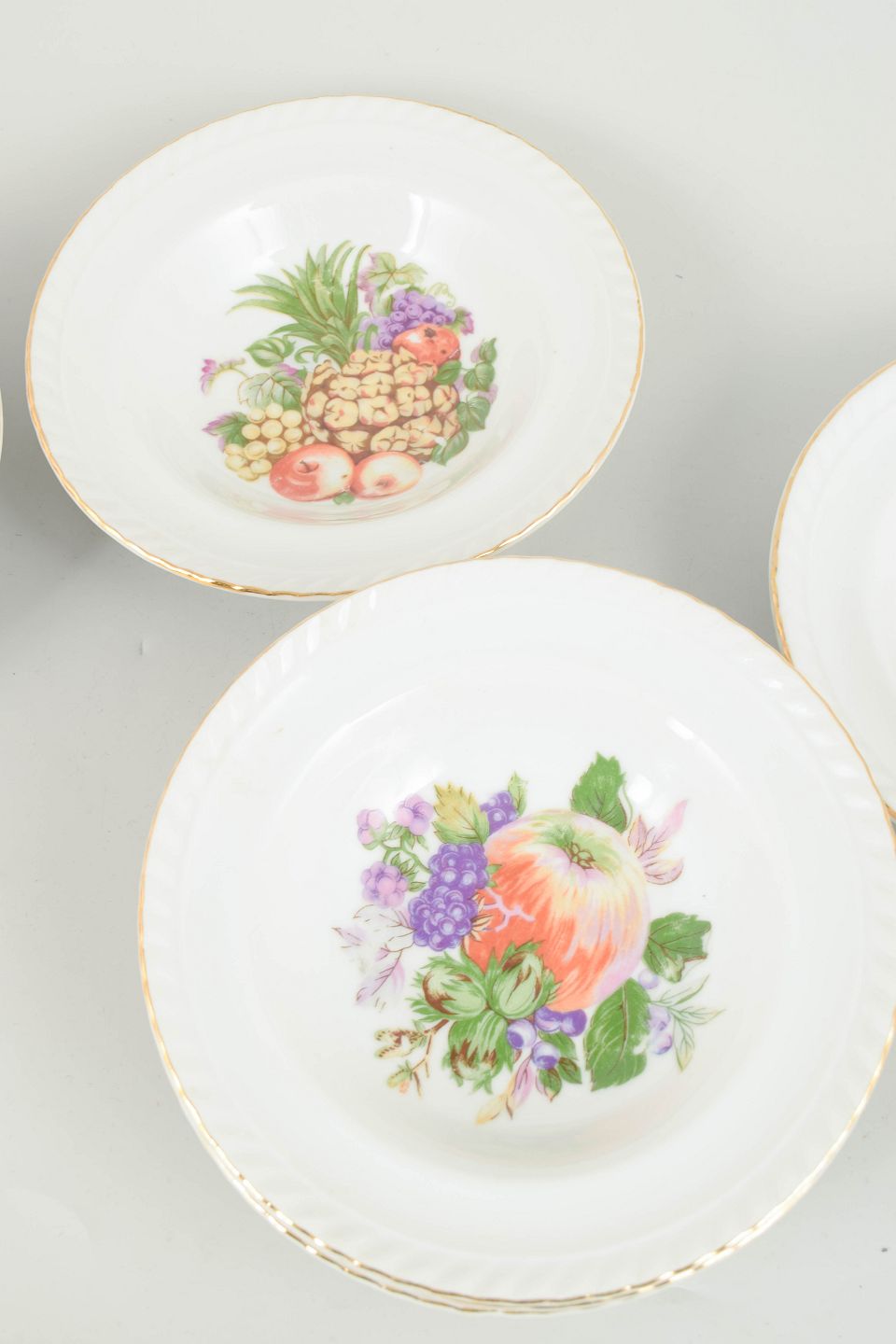 Sæt af seks porcelænsskåle dekoreret med polykrom frugtdekoration og guldkant. Klassisk europæisk bordporcelæn i tidstypisk mellemkrigsstil. Mærket på undersiden.
