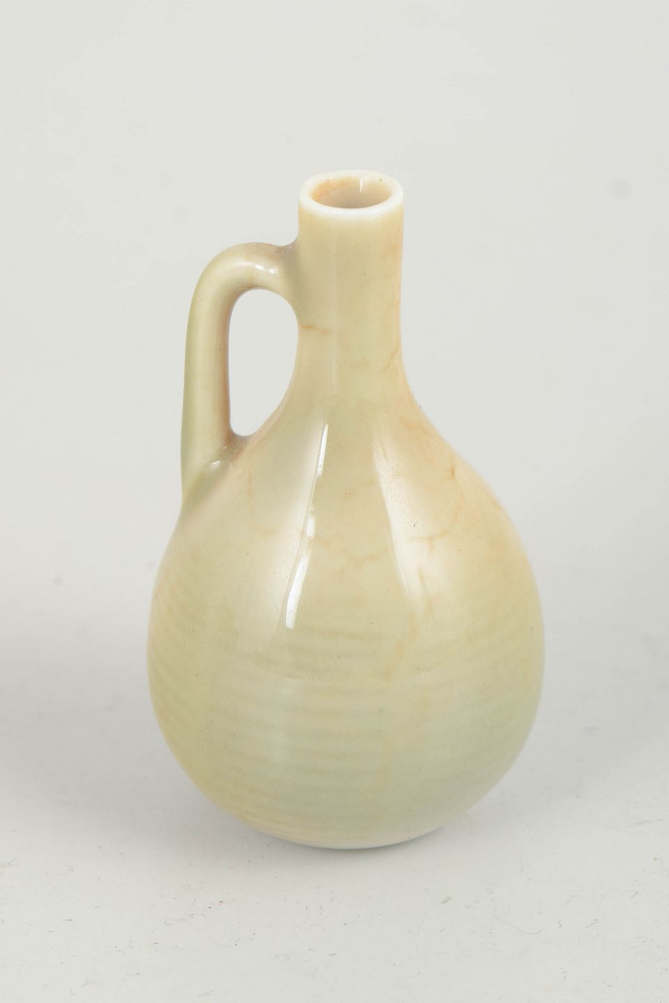 Lille organisk formet miniaturekande i glaseret stentøj med blød cremefarvet glasur. Signeret i bunden.