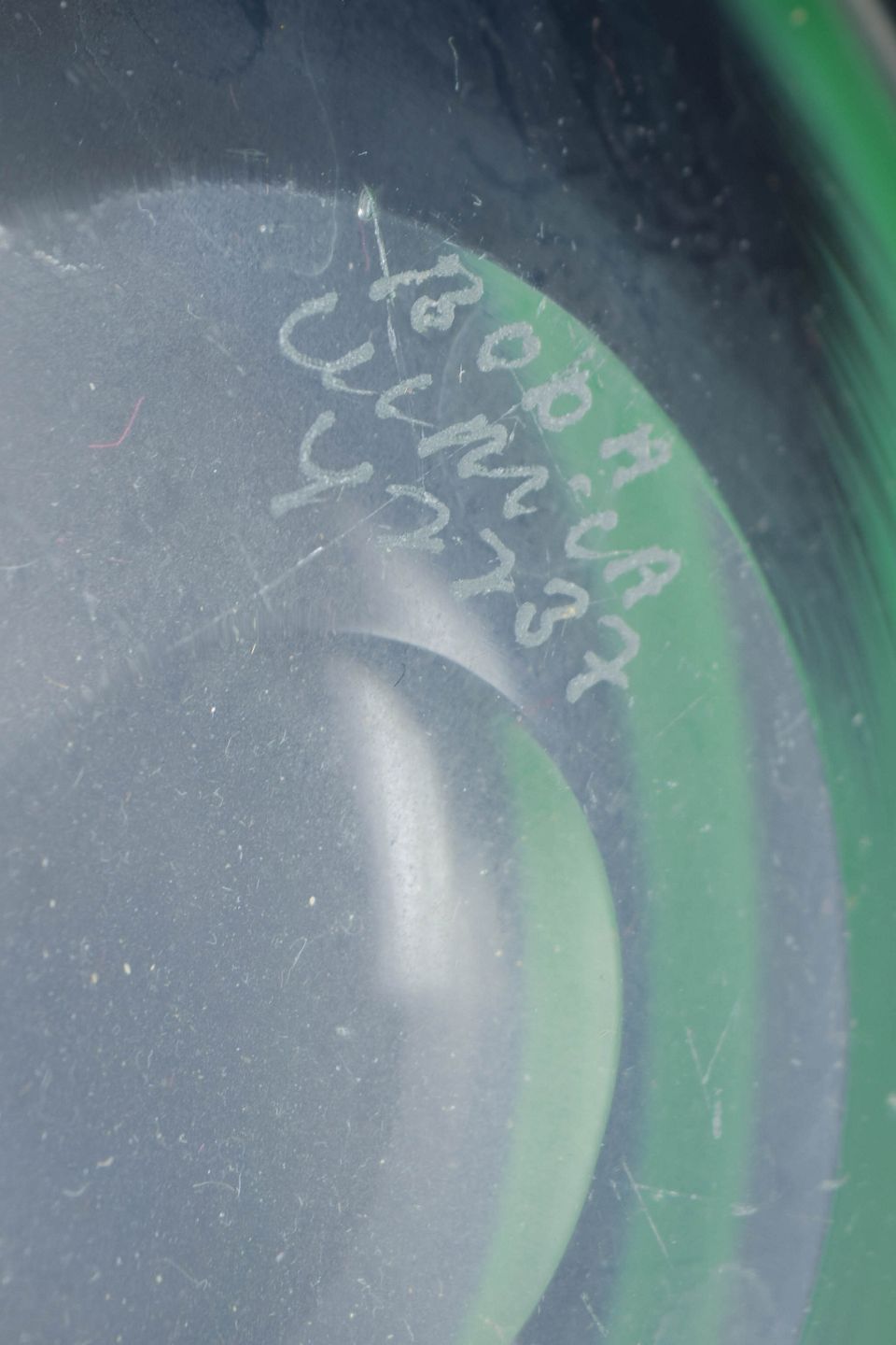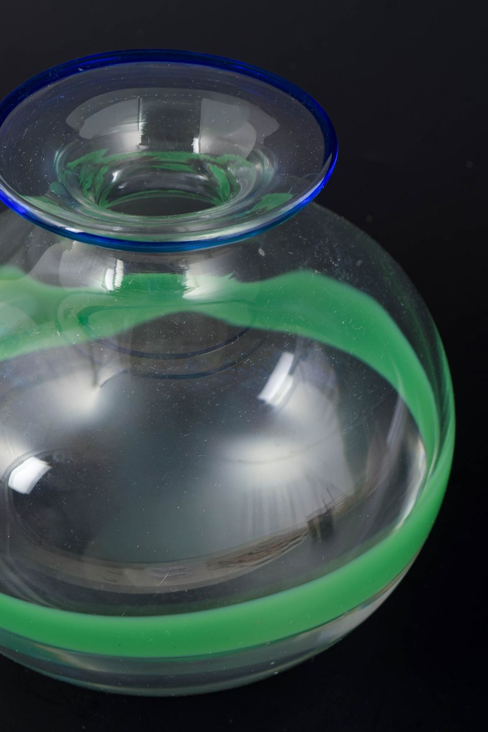 Rund, blæst kunstglasvase i klart glas med bred grøn horisontal bånddekoration og blå markeret munding.